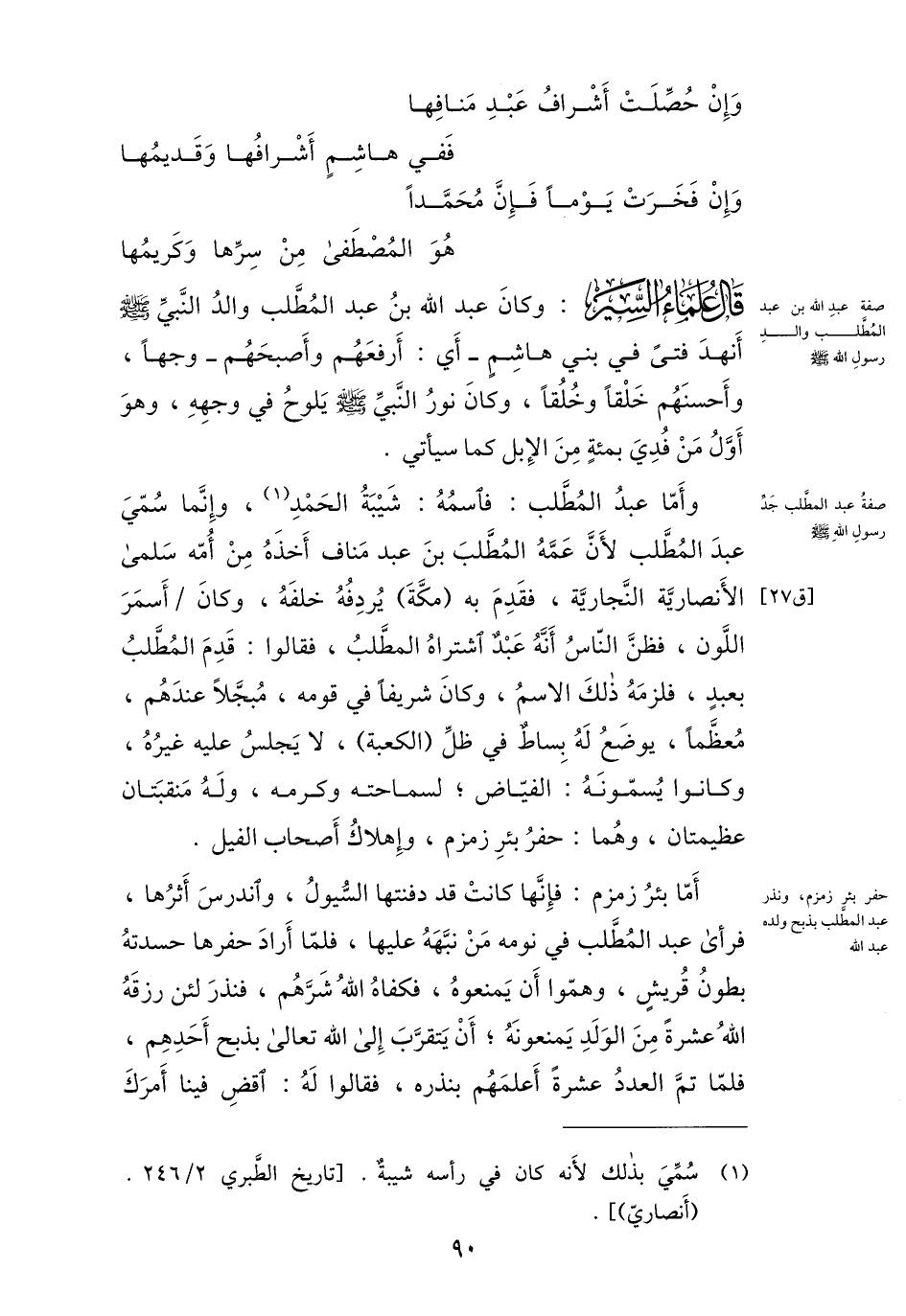 قال علماء السّير: وكان عبد الله بن عبد المطّلب والد النّبيّ صلى الله عليه وسلم أنهد فتى في بني هاشم- أي: أرفعهم وأصبحهم- وجها، وأحسنهم خلقا وخلقا، وكان نور النّبيّ صلى الله عليه وسلم يلوح في وجهه، وهو أوّل من فدي بمئة من الإبل كما سيأتي.