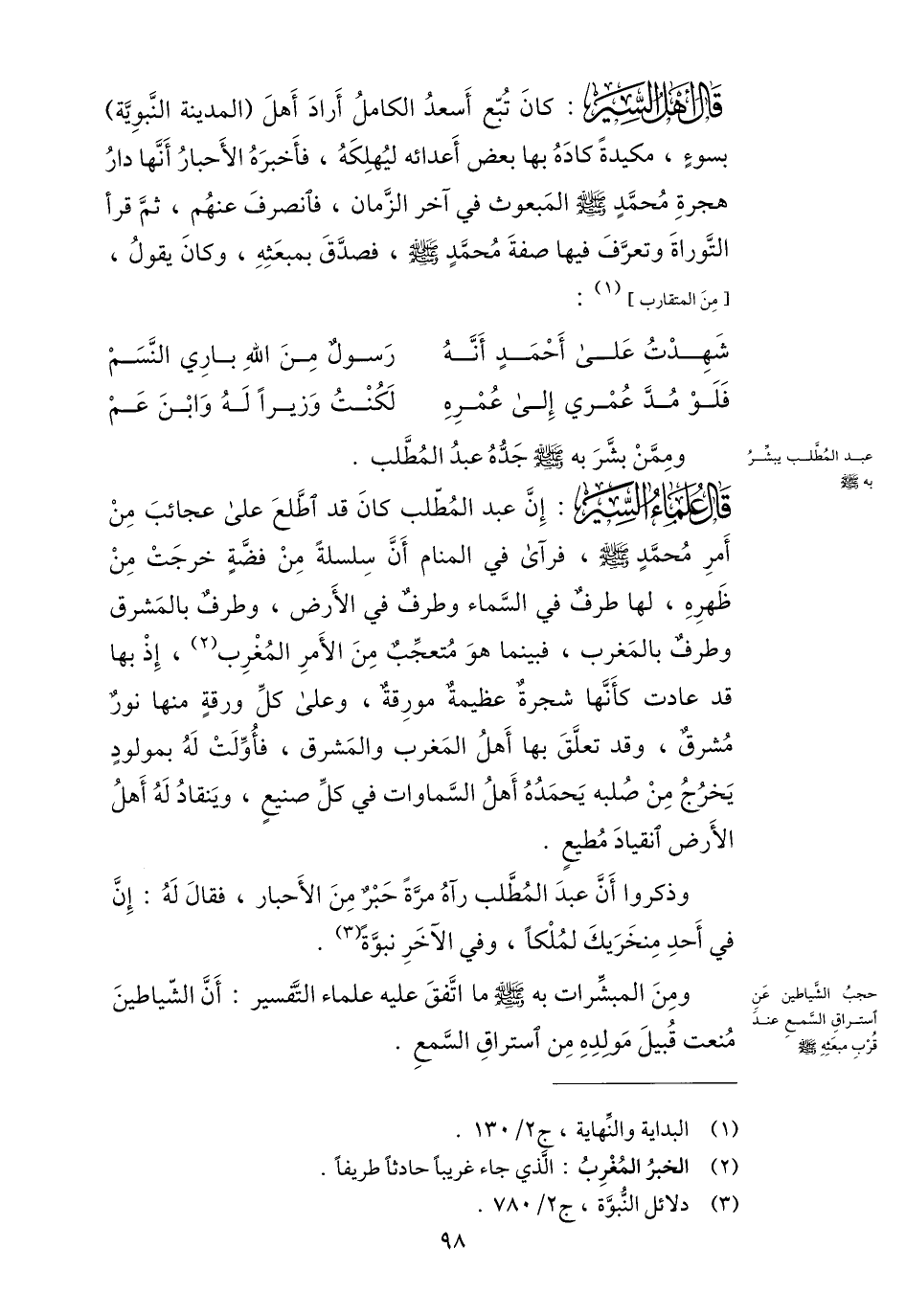 قال علماء السّير: إنّ عبد المطّلب كان قد اطّلع على عجائب من أمر محمّد صلى الله عليه وسلم، فرآى في المنام أنّ سلسلة من فضّة خرجت من ظهره، لها طرف في السّماء وطرف في الأرض، وطرف بالمشرق وطرف بالمغرب، فبينما هو متعجّب من الأمر المغرب «2» ، إذ بها قد عادت كأنّها شجرة عظيمة مورقة، وعلى كلّ ورقة منها نور مشرق، وقد تعلّق بها أهل المغرب والمشرق، فأوّلت له بمولود يخرج من صلبه يحمده أهل السّماوات في كلّ صنيع، وينقاد له أهل الأرض انقياد مطيع.