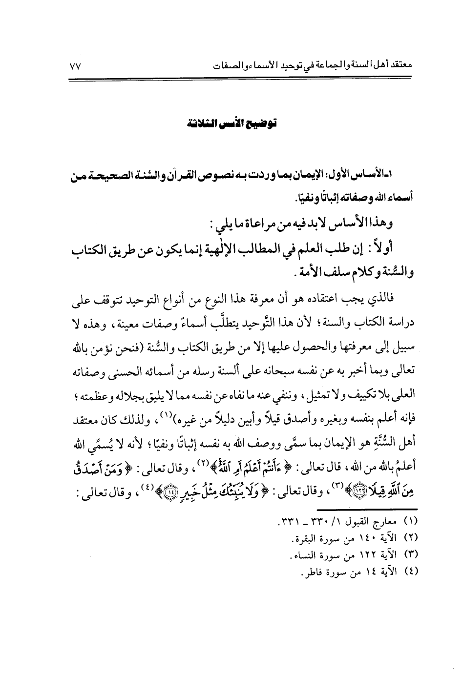 ا- الأساس الأول: الإيمان بما وردت به نصوص القرآن والسنة الصحيحة من أسماء الله وصفاته إثباتا ونفيا.