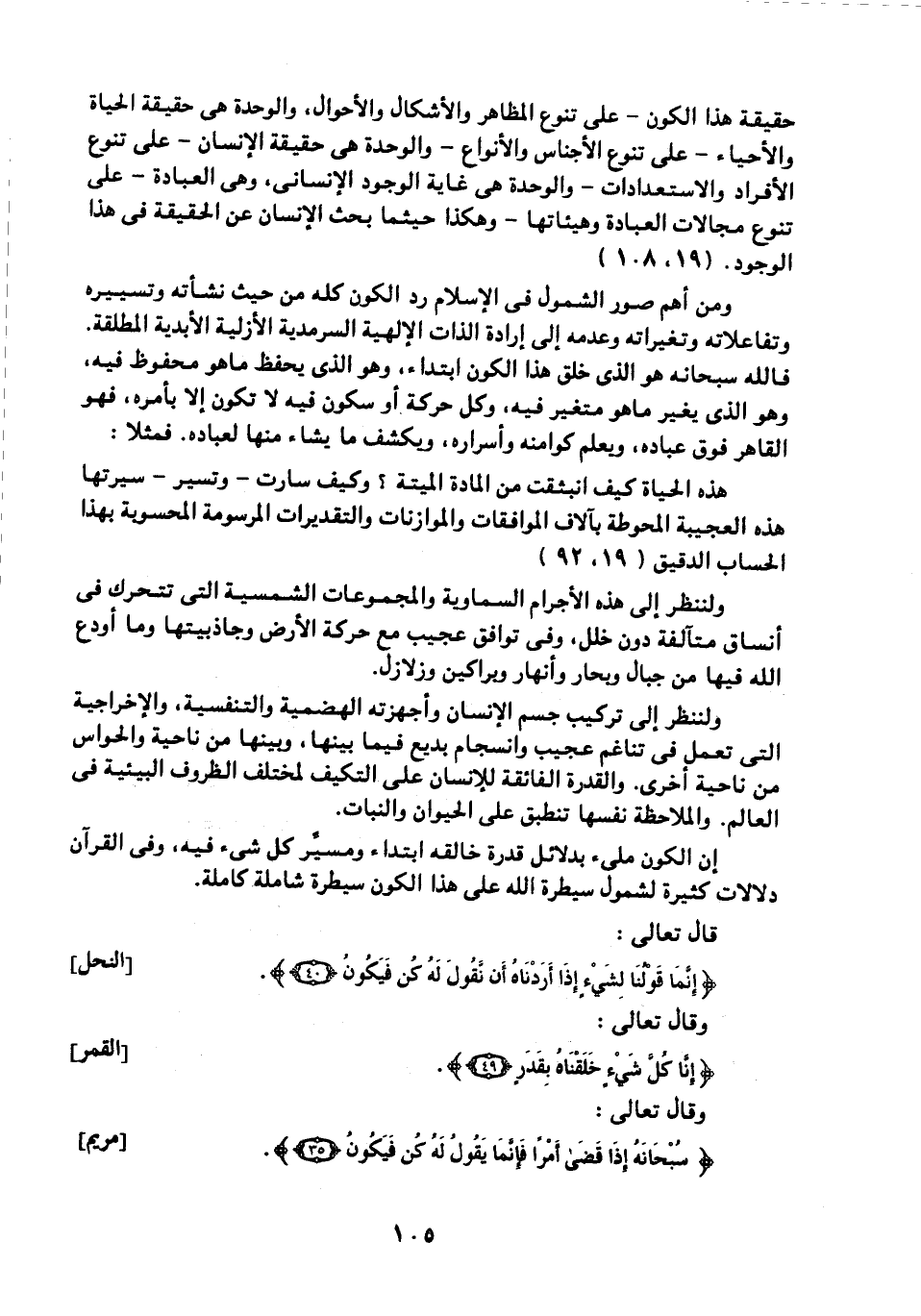 حقيقة هذا الكون, على تنوع المظاهر والأشكال والأحوال، والوحدة هي حقيقة الحياة والأحياء, على تنوع الأجناس والأنواع. والوحدة هي حقيقة الإنسان, على تنوع الأفراد والاستعدادات، والوحدة هي غاية الوجود الإنساني، وهي العبادة، على تنوع مجالات العبادة وهيئاتها، وهكذا حيثما بحث الإنسان عن الحقيقة في هذا الوجود ... "19، 107".