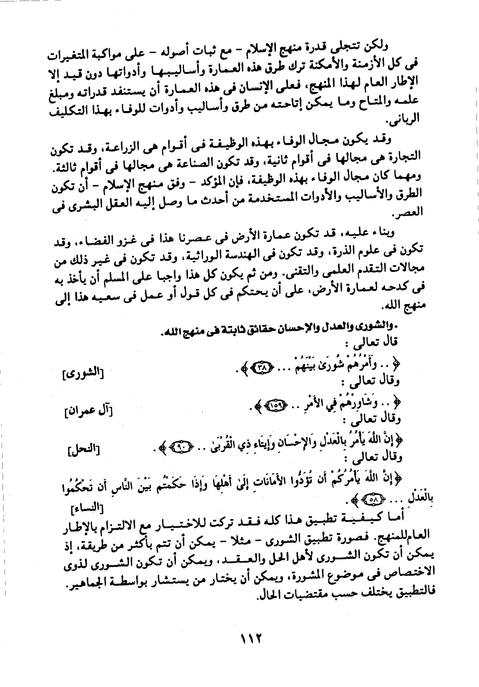 ولكن تتجلى قدرة منهج الإسلام -مع ثبات أصوله- على مواكبة المتغيرات في كل الأزمنة والأمكنة ترك طرق هذه العمارة وأساليبها، وأدواتها دون قيد, إلا الإطار العام لهذا المنهج، فعلى الإنسان في هذه العمارة أن يستنفد قدراته ومبلغ علمه والمتاح, وما يمكن إتاحته من طرق وأساليب وأدوات للوفاء بهذا التكليف الرباني.