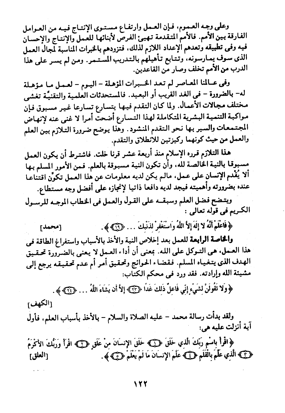 ويتضح فضل العلم وسبقه على القول والعمل في الخطاب الموجه للرسول الكريم في قوله تعالى: {فَاعْلَمْ أَنَّهُ لا إِلَهَ إِلَّا اللَّهُ وَاسْتَغْفِرْ لِذَنْبِكَ} [محمد: 19] .