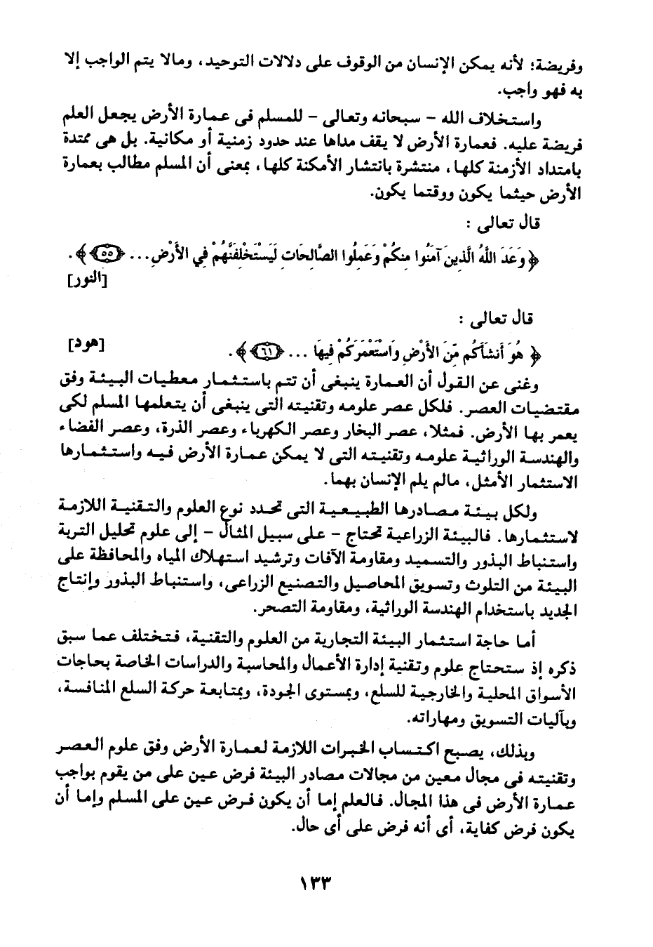 وبذلك يصبح اكتساب الخبرات اللازمة لعمارة الأرض وفق علوم العصر وتقنيته في مجال معين من مجالات مصادر البيئة فرض عين على من يقوم بواجب عمارة الأرض في هذا المجال. فالعلم إما أن يكون فرض عين على المسلم وإما أن يكون فرض كفاية، أي: إنه فرض على أي حال.