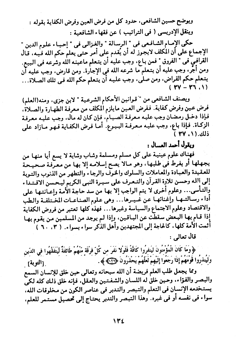 فهناك علوم عينية على كل مسلم ومسلمة وشاب وشابة لا يسع أيا منها من يجهلها أو يفرط في طلبها، وهو ما لا يصح إسلامه إلا بها من معرفة صحيحة للعقيدة والعبادة والمعاملات والسلوك والخوف والرجاء والتطهر من الذنوب والتوبة إلى الله وحسن تلاوة القرآن والتعرف على سيرة النبي الكريم ليحسن الاقتداء والتأسي.. وعلوم أخرى لا يتم الواجب إلا بها من سد حاجة الأمة وإعانتها على أداء رسالتها وإغنائها عن غيرها ... وهي علوم الصناعات المختلفة والطب والاقتصاد وعلوم الاجتماع والسياسة وغيرها ... فهذه كلها تعتبر من فروض الكفاية إذا قام بها البعض سقطت عن الباقين، وإذا لم يوجد من المسلمين من يقوم بها أثمت الأمة كلها، كالحاجة إلى المجتهدين وأهل الذكر سواء بسواء. "3، 60".