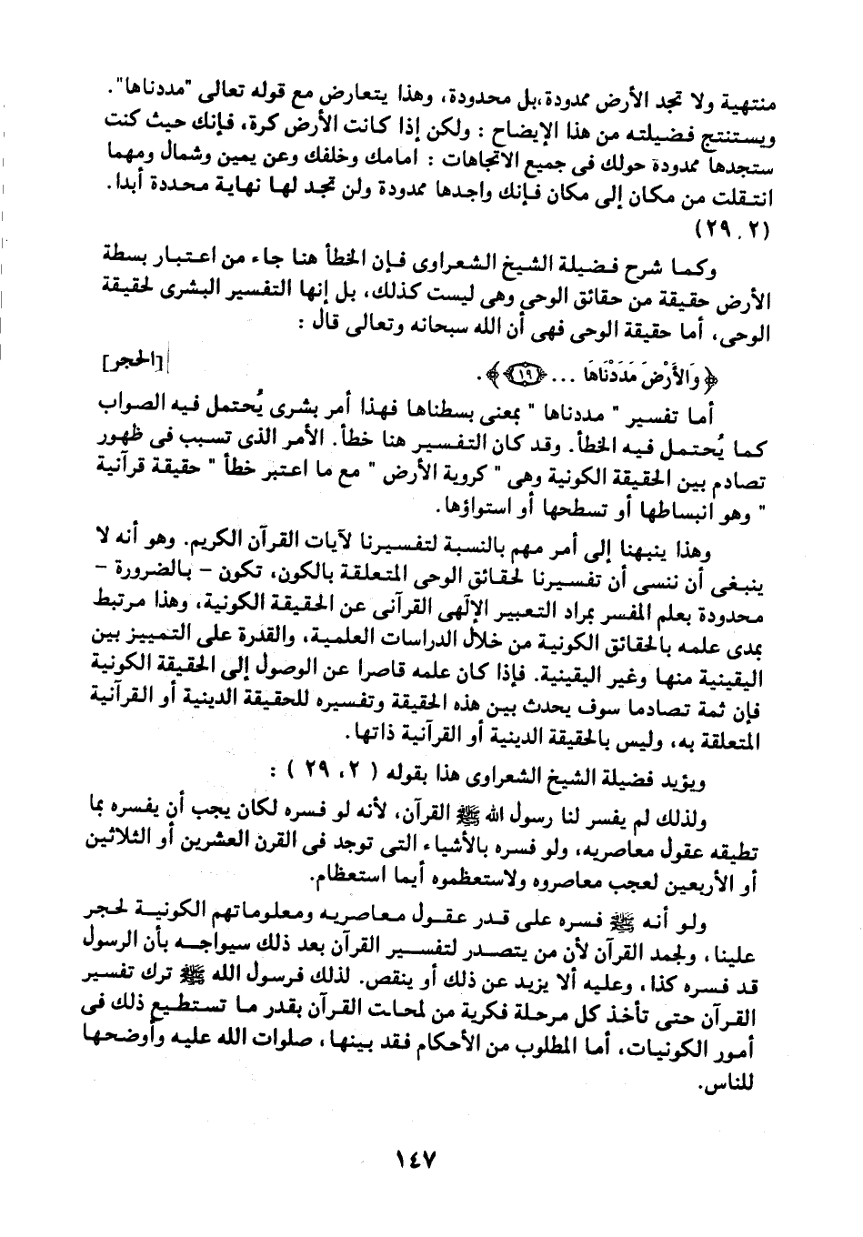وكما شرح فضيلة الشيخ الشعراوي فإن الخطأ هنا جاء من اعتبار بسطة الأرض حقيقة من حقائق الوحي وهي ليست كذلك، بل إنها التفسير البشري لحقيقة الوحي، وأما حقيقة الوحي فهي أن الله سبحانه وتعالى قال: {وَالْأَرْضَ مَدَدْنَاهَا} [الحجر: 19] .