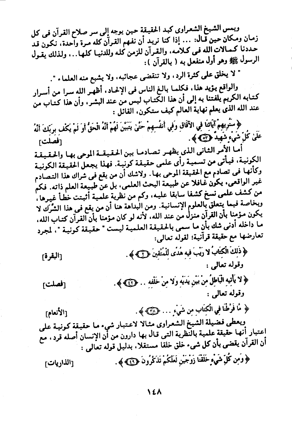 ويمس الشيخ الشعراوي كبد الحقيقة حين يوجه إلى سر صلاح القرآن في كل زمان ومكان حين قال: إذا كنا نريد أن نفهم القرآن مرة واحدة، نكون قد حددنا كمالات الله في كلامه، والقرآن للزمن كله وللدنيا كلها ... ولذلك يقول الرسول -صلى الله عليه وسلم- وهو أول منفعل به "بالقرآن": "لا يخلق على كثرة الرد، ولا تنقضي عجائبه، ولا يشبع منه العلماء".