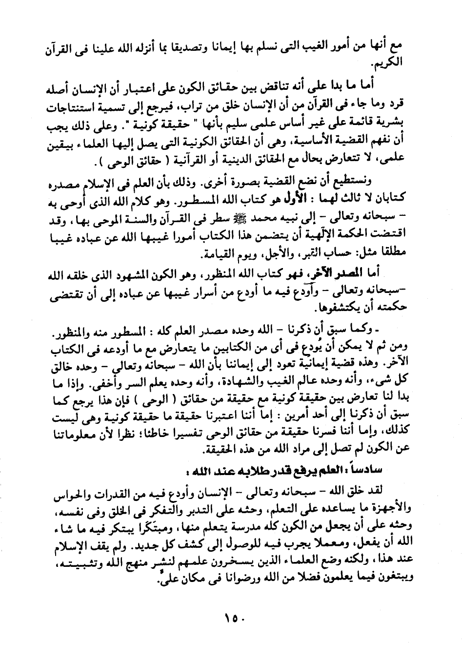 ونستطيع أن نضع القضية بصورة أخرى. وذلك بأن العلم في الإسلام مصدره كتابان لا ثالث لهما: الأول هو كتاب الله المسطور. وهو كلام الله الذي أوحى به -سبحانه وتعالى- إلى نبية محمد -صلى الله عليه وسلم- سطر في القرآن والسنة الموحى بها، وقد اقتضت الحكمة الإلهية أن يتضمن هذا الكتاب أمورًا غيبها الله عن عبادة غيبا مطلقًا مثل: حساب القبر: والأجل، ويوم القيامة: