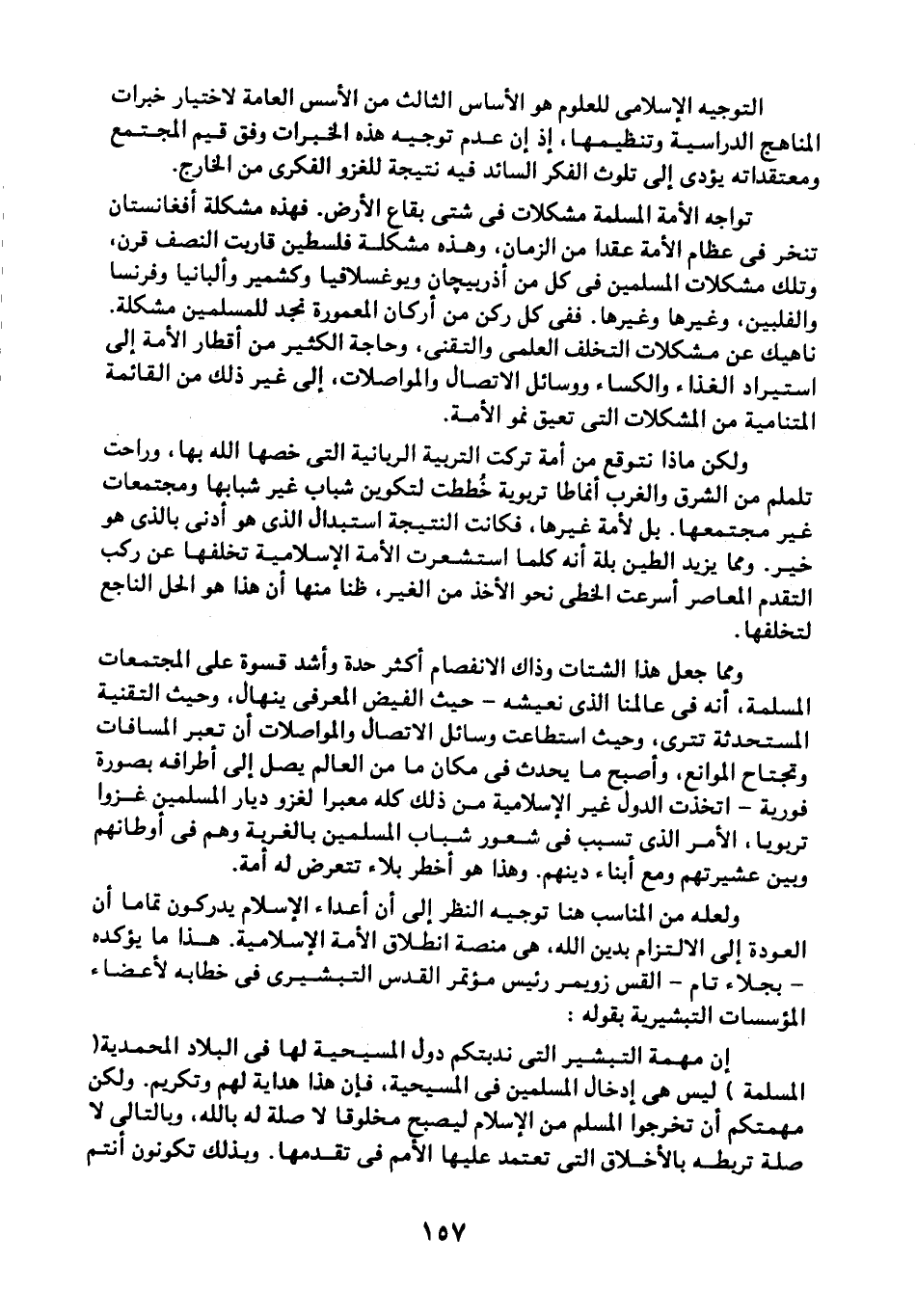 إن مهمة التبشير التي ندبتكم دول المسيحية لها في البلاد المحمدية "المسلمة" ليس هي إدخال المسلمين في المسيحية، فإن هذا هداية لهم وتكريم. ولكن مهمتكم أن تخرجوا المسلم من الإسلام ليصبح مخلوقًا لا صلة له بالله، وبالتالي لا صلة تربطه بالأخلاق التي تعتمد عليها الأمم في تقدمها. وبذلك تكونون أنتم