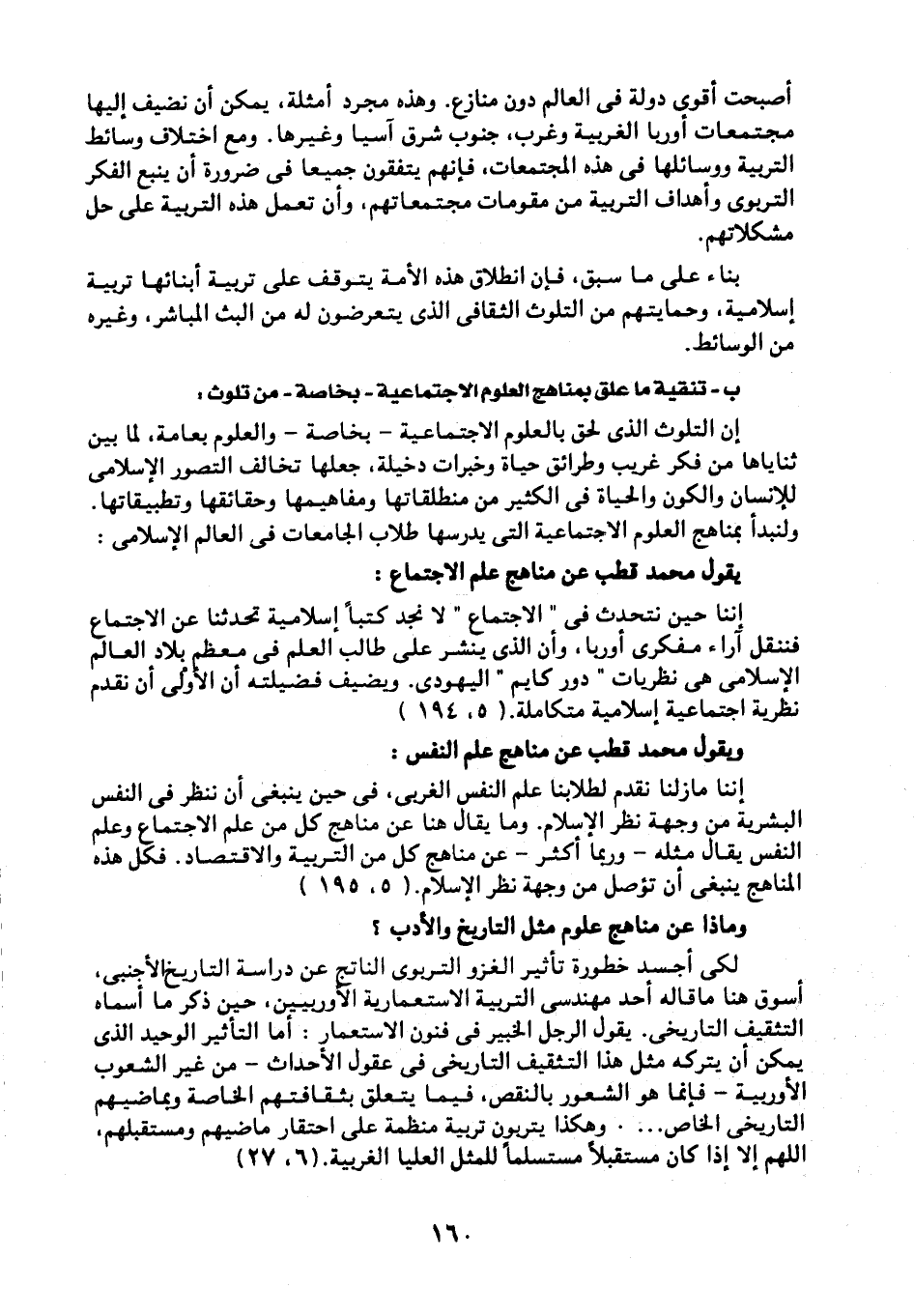 إننا ما زلنا نقدم لطلابنا علم النفس الغربي، في حين ينبغي أن ننظر في النفس البشرية من وجهة نظر الإسلام. وما يقال هنا عن مناهج كل من علم الاجتماع وعلم النفس يقال مثله -وربما أكثر- عن مناهج كل من التربية والاقتصاد. فكل هذه المناهج ينبغي أن تؤصل من وجهة نظر الإسلام. "5، 195".