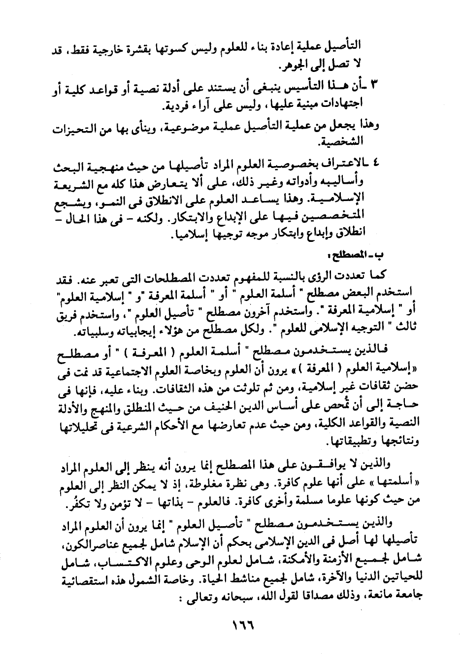 4- الاعتراف بخصوصية العلوم المراد تأصيلها من حيث منهجية البحث وأساليبه وأدواته وغير ذلك، على ألا يتعارض هذا كله مع الشريعة الإسلامية، وهذا يساعد العلوم على الانطلاق في النمو، ويشجع المتخصصين فيها على الإبداع والابتكار، ولكنه -في هذا الحال- انطلاق وإبداع وابتكار موجه توجيهًا إسلاميا.