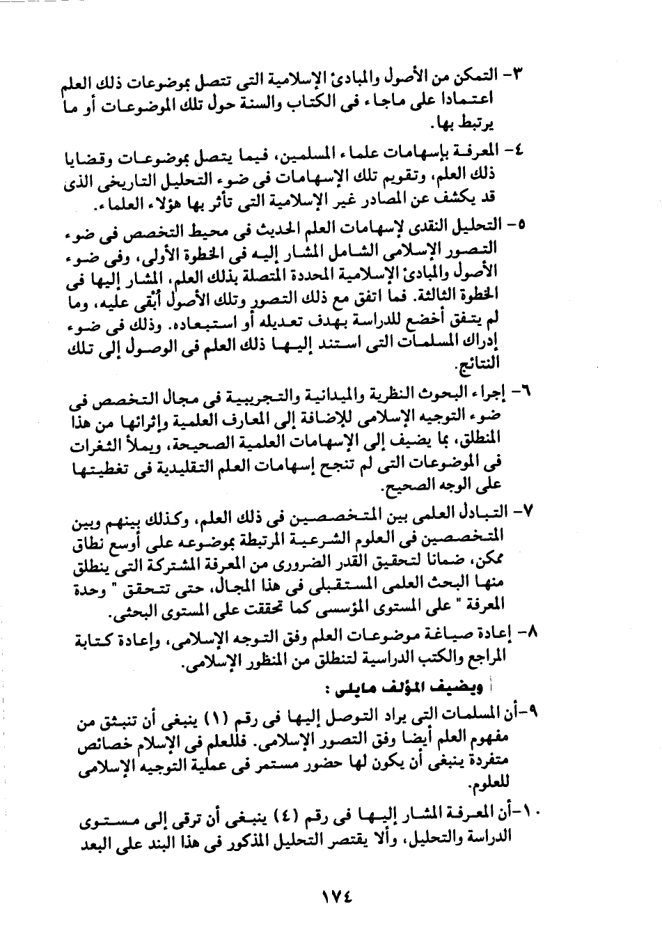 8- إعادة صياغة موضوعات العلم وفق التوجيه الإسلامي، وإعادة كتابة المراجع والكتب الدراسية لتنطلق من المنظور الإسلامي.