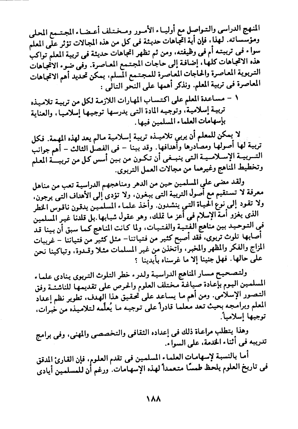 لا يمكن للمعلم أن يربي تلاميذه تربية إسلامية ما لم يعد لهذه المهمة. فكل تربية لها أصولها ومصادرها وأهدافها. وقد بينا -في الفصل الثالث- أهم جوانب التربية الإسلامية التي ينبغي أن تكون من بين أسس كل من تربية المعلم وتخطيط المناهج وغيرهما من مجالات العمل التربوي.