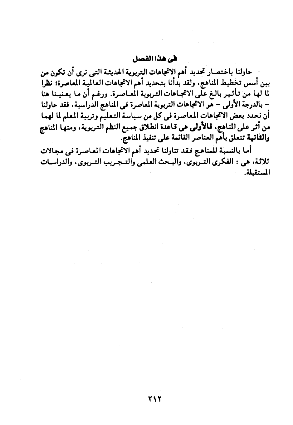 أما بالنسبة للمناهج فقد تناولنا تحديد أهم الاتجاهات المعاصرة، في مجالات ثلاثة هي: الفكري التربوي، والبحث العلمي والتجريب التربوي، والدراسات المستقبلة.