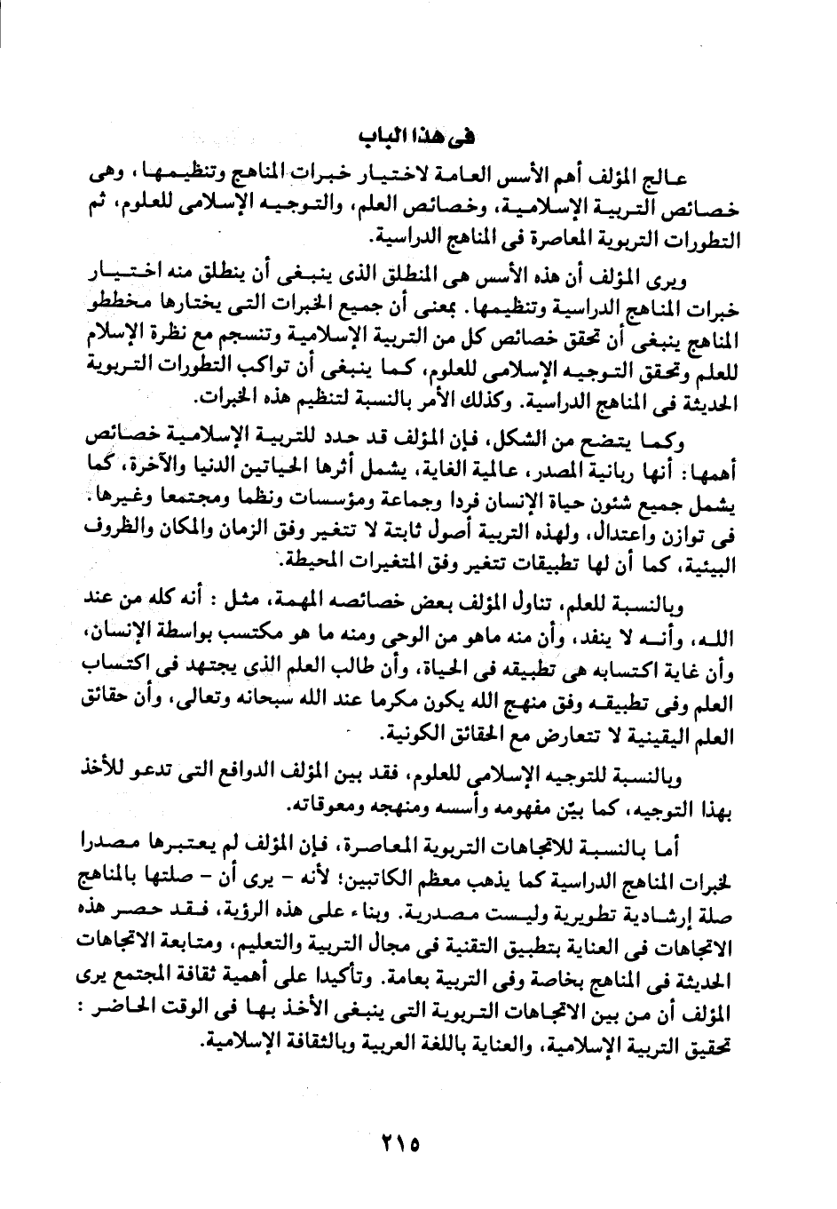 عالج المؤلف أهم الأسس العامة لاختيار خبرات المناهج وتنظيمها، وهي خصائص التربية الإسلامية، وخصائص العلم، والتوجيه الإسلامي للعلوم، ثم التطورات التربوية المعاصرة في المناهج الدراسية.