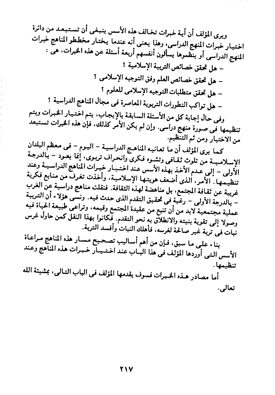 كما يرى المؤلف أن ما تعانيه المناهج الدراسية -اليوم- في معظم البلدان الإسلامية من تلوث ثقافي وتشوه فكري وانحراف تربوي، إنما يعود -بالدرجة الأولى- إلى عدم الأخذ بهذه الأسس عند اختيار خبرات المناهج الدراسية وعند تنظيمها. الأمر الذي أضعف هويتها الإسلامية، وأخذت تغرف من منابع فكرية غربية عن ثقافة المجتمع, بل مناهض لهذه الثقافة. فنقلت مناهج دراسية عن الغرب -بالدرجة الأولى- رغبة في تحقيق التقدم الذي حدث فيه. ونسي هؤلاء أن التربية عملية مجتمعية لا بد من أن تنبع من عقيدة المجتمع وقيمه. وتراعي طبيعة الحياة فيه وصولًا إلى تقوية بنيته والانطلاق به نحو التقدم. فكانوا بهذا النقل كمن حاول غرس نبات في تربة غير صالحة لغرسه، فأهلك النبات وأفسد التربة.