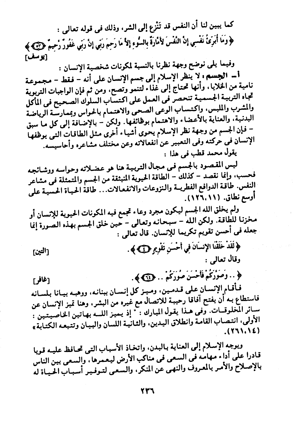 ليس المقصود بالجسم في مجال التربية هنا هو عضلاته وحواسه ووشائجه فحسب، وإنما نقصد -كذلك- الطاقة الحيوية المنبثقة من الجسم والمتمثلة في مشاعر النفس. طاقة الدوافع الفطرية والنزوعات والانفعالات.. طاقة الحياة الحسية على أوسع نطاق. "11، 126".