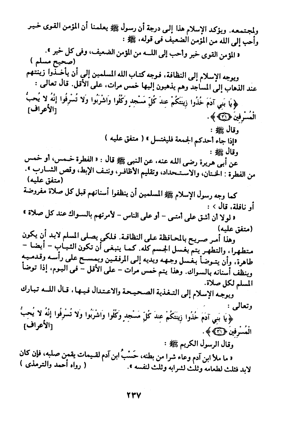 ويوجه الإسلام إلى التغذية الصحيحة والاعتدال فيها، قال الله تبارك وتعالى: {يَا بَنِي آدَمَ خُذُوا زِينَتَكُمْ عِنْدَ كُلِّ مَسْجِدٍ وَكُلُوا وَاشْرَبُوا وَلا تُسْرِفُوا إِنَّهُ لا يُحِبُّ الْمُسْرِفِينَ} [الأعراف: 31] .