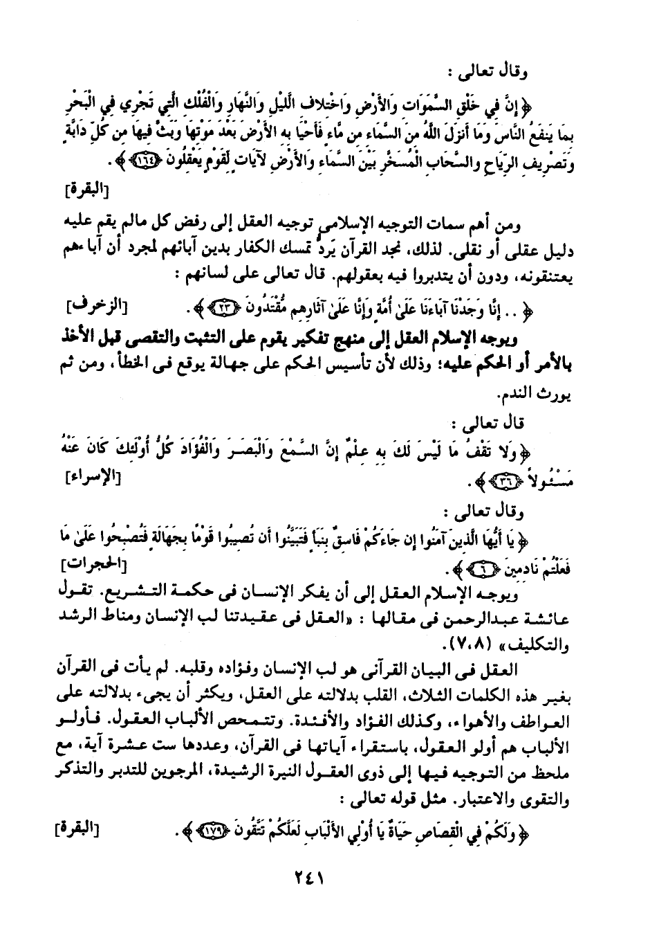 ويوجه الإسلام العقل إلى أن يفكر الإنسان في حكمة التشريع. تقول عائشة عبد الرحمن في مقالها: "العقل في عقيدتنا لب الإنسان ومناط الرشد والتكليف" "8، 7".
