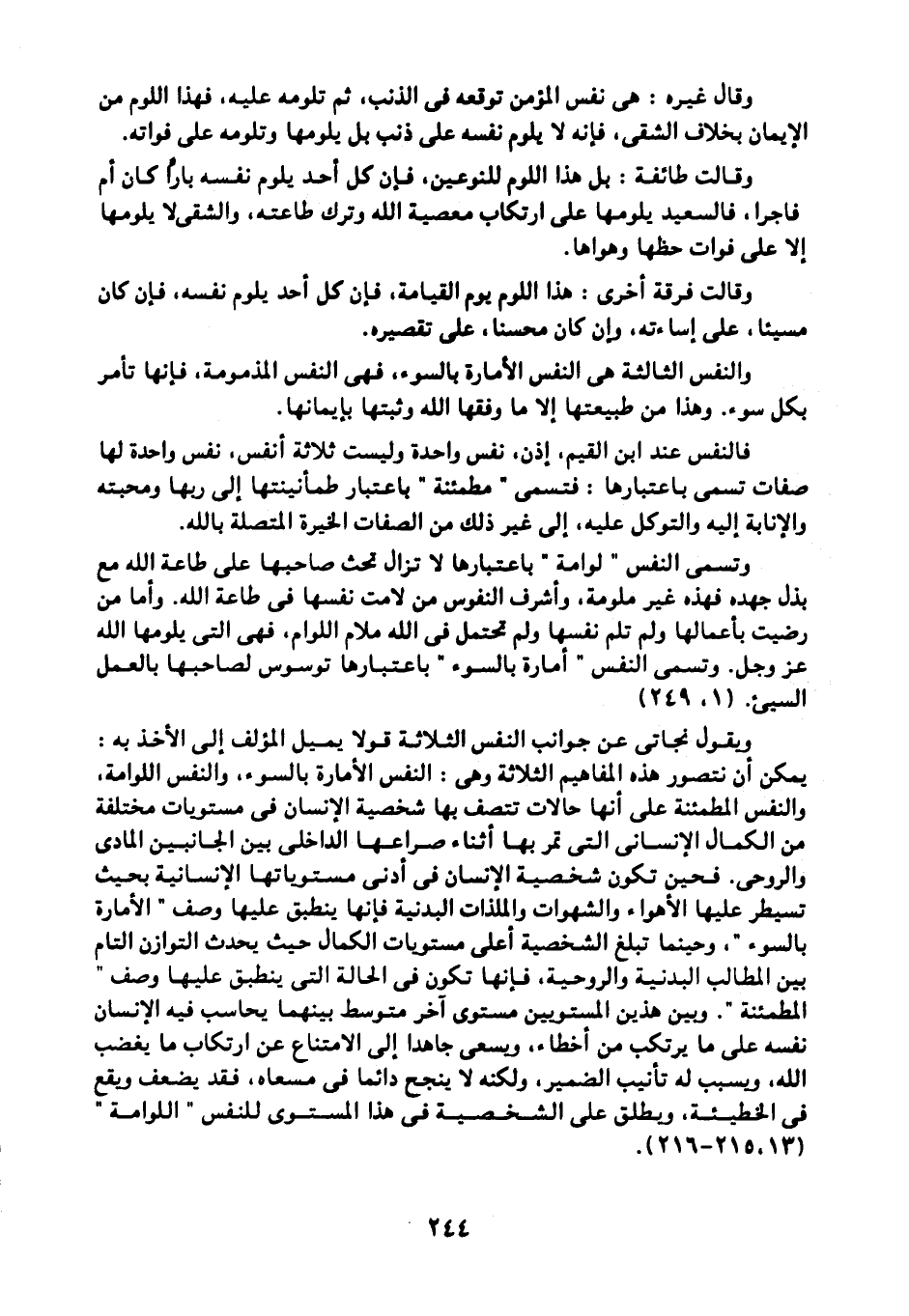 ويقول نجاتي عن جوانب النفس الثلاثة قولا يميل المؤلف إلى الأخذ به: يمكن أن نتصور هذه المفاهيم الثلاثة وهي: النفس الأمارة بالسوء، والنفس اللوامة، والنفس المطمئنة على أنها حالات تتصف بها شخصية الإنسان في مستويات مختلفة من الكمال الإنساني التي تمر بها أثناء صراعها الداخلي بين الجانبين المادي والروحي. فحين تكون شخصية الإنسان في أدنى مستوياتها الإنسانية بحيث تسيطر عليها الأهواء والشهوات والملذات البدنية فإنها ينطبق عليه وصف "الأمارة بالسوء". وحينما تبلغ الشخصية أعلى مستويات الكمال حيث يحدث التوازن التام بين المطالب البدنية والروحية، فإنها تكون في الحالة التي ينطبق عليها وصف المطمئنة". وبين هذين المستويين مستوى آخر متوسط بينهما يحاسب فيه الإنسان نفسه على ما يرتكب من أخطاء, ويسعى جاهدًا إلى الامتناع عن ارتكاب ما يغضب الله، ويسبب له تأنيب الضمير، ولكنه لا ينجح دائمًا في مسعاه، فقد يضعف ويقع في الخطيئة، ويطلق على الشخصية في هذا المستوى للنفس "اللوامة" "13، 215-216".