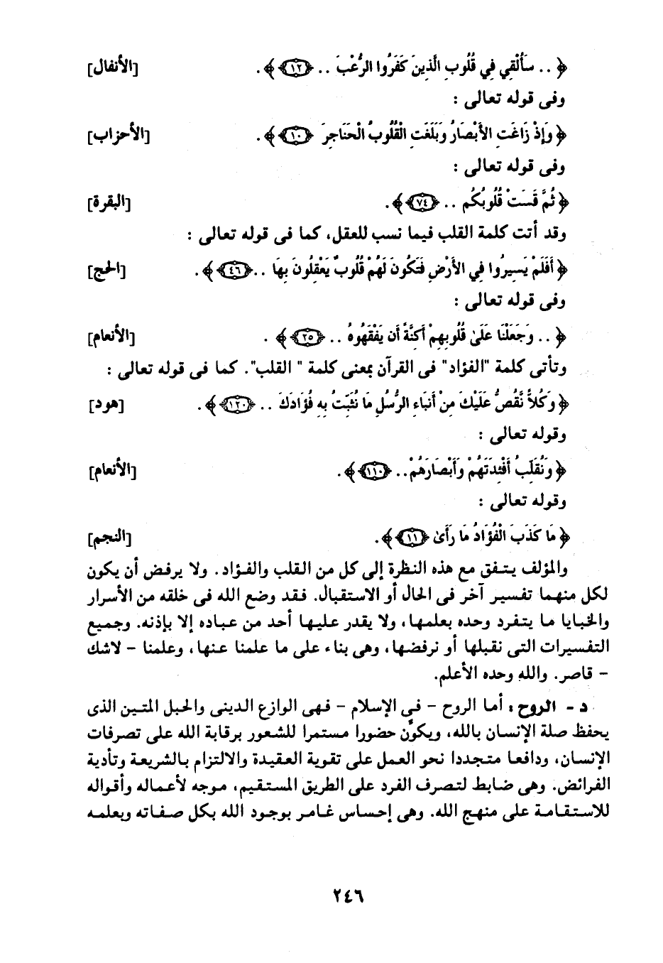 والمؤلف يتفق مع هذه النظرة إلى كل من القلب والفؤاد. ولا يرفض أن يكون لكل منهما تفسير آخر في الحال أو الاستقبال. فقد وضع الله في خلقه من الأسرار والخبايا ما يتفرد وحده بعلمها، ولا يقدر عليها أحد من عباده إلا بإذنه. وجميع التفسيرات التي نقبلها أو نرفضها، وهي بناء على ما علمنا عنها، وعلمنا -لا شك- قاصر. والله وحده الأعلم.