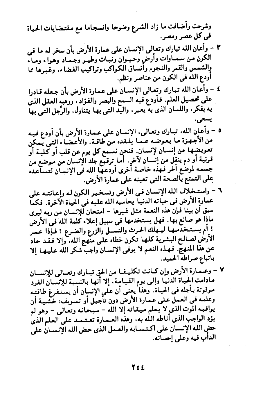 4- وأعان الله تبارك وتعالى الإنسان على عمارة الأرض بأن جعله قادرًا على تحصيل العلم. فأودع فيه السمع والبصر والفؤاد، ووهب العقل الذي به يفكر، واللسان الذي به يعبر، واليد التي بها يتناول، والرجل التي بها يسعى.