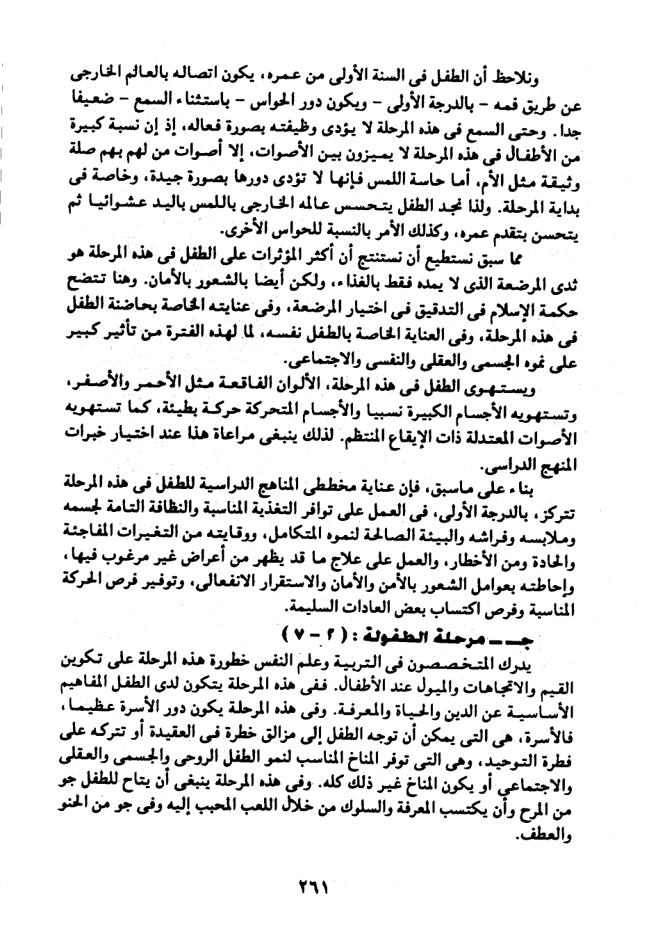 يدرك المتخصصون في التربية وعلم النفس خطورة هذه المرحلة على تكوين القيم والاتجاهات والميول عند الأطفال. ففي هذه المرحلة يتكون لدى الطفل المفاهيم الأساسية عن الدين والحياة والمعرفة. وفي هذه المرحلة يكون دور الأسرة عظيمًا, فالأسرة هي التي يمكن أن توجه الطفل إلى مزالق خطرة في العقيدة أو تتركه على فطرة التوحيد، وهي التي توفر المناخ المناسب لنمو الطفل الروحي والجسمي والعقلي والاجتماعي أو يكون المناخ غير ذلك كله. وفي هذه المرحلة ينبغي أن يتاح للطفل جو من المرح, وأن يكتسب المعرفة والسلوك من خلال اللعب المحبب إليه, وفي جو من الحنو والعطف.