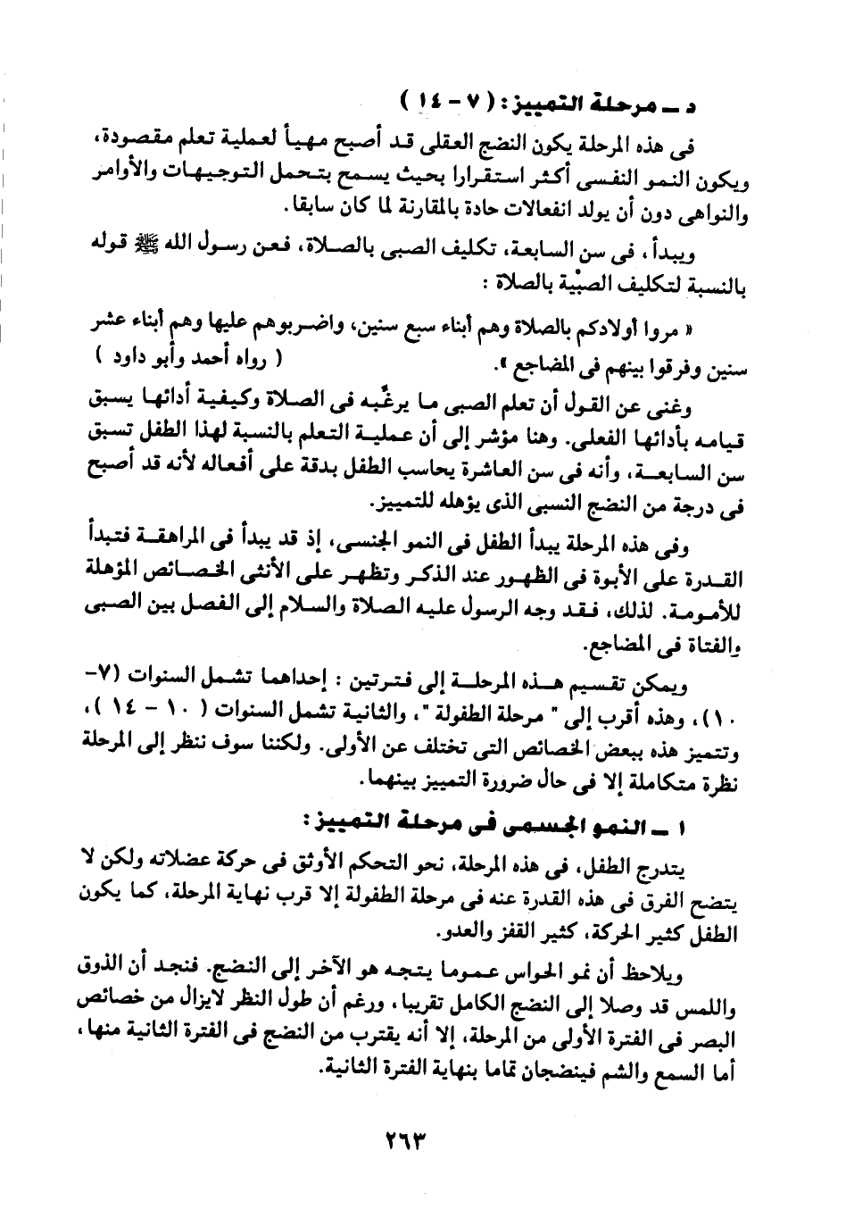 وغني عن القول أن تعلم الصبي ما يرغبه في الصلاة, وكيفية أدائها يسبق قيامه بأدائها الفعلي. وهنا مؤشر أن عملية التعلم بالنسبة لهذا الطفل تسبق سن السابعة، وأنه في سن العاشرة يحاسب الطفل بدقة على أفعالة؛ لأنه قد أصبح في درجة من النضج النسبي الذي يؤهله للتمييز.
