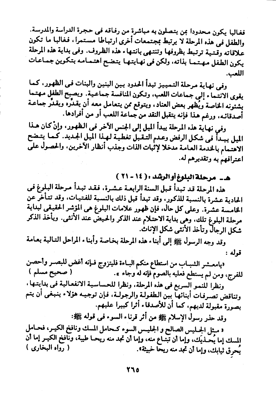 وقد وجه الرسول -صلى الله عليه وسلم- إلى أبناء هذه المرحلة بخاصة, وأبناء المراحل التالية بعامة قوله: "يا معشر الشباب من استطاع منكم الباءة فليتزوج فإنه أغض للبصر وأحصن للفرج، من لم يستطع فعليه بالصوم فإنه له وجاء". "صحيح مسلم".