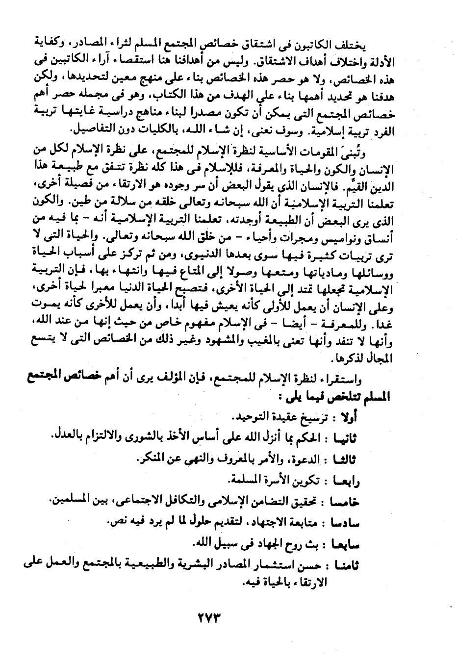 واستقراء لنظرة الإسلام للمجتمع، فإن المؤلف يرى أن أهم خصائص المجتمع المسلم تتلخص فيما يلي: