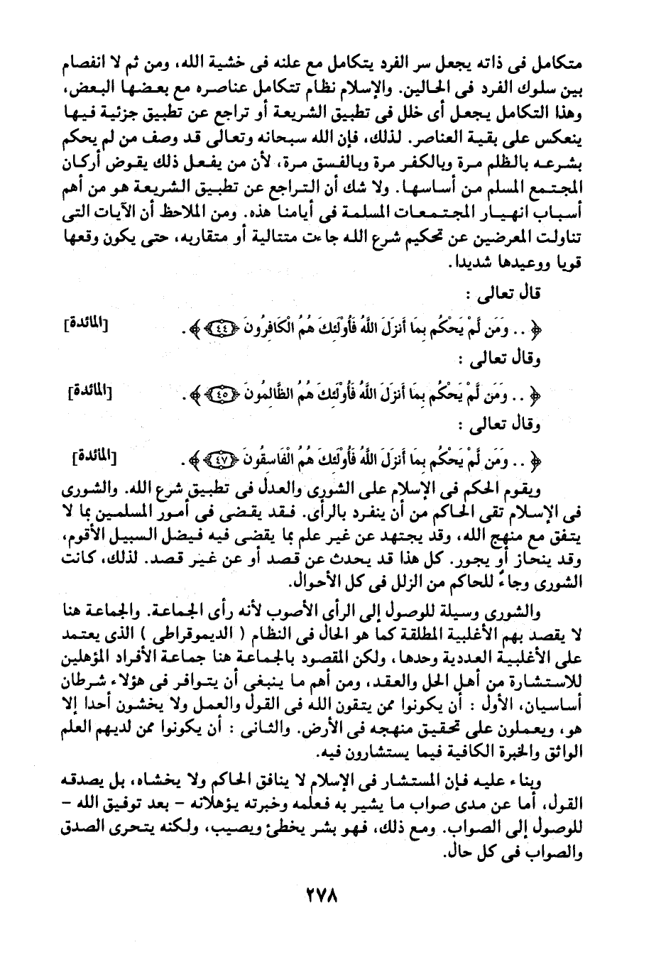 متكامل في ذاته يجعل سر الفرد يتكامل مع علنه في خشية الله، ومن ثم لا انفصام بين سلوك الفرد في الحالتين. والإسلام نظام تتكامل عناصره مع بعضها البعض، وهذا التكامل يجعل أي خلل في تطبيق الشريعة أو تراجع عن تطبيق جزئية فيها ينعكس على بقية العناصر. لذلك فإن الله سبحانه وتعالى قد وصف من لم يحكم بشرعه بالظلم مرة وبالكفر مرة وبالفسق مرة؛ لأن من يفعل ذلك يقوض أركان المجتمع المسلم من أساسها، ولا شك أن التراجع عن تطبيق الشريعة هو من أهم أسبباب انهيار المجتمعات المسلمة في أيامنا هذه. ومن الملاحظ أن الآيات التي تناولت المعرضين عن تحكيم شرع الله جاءت متتالية أو متقاربة، حتى يكون وقعها قويا ووعيدها شديدًا.