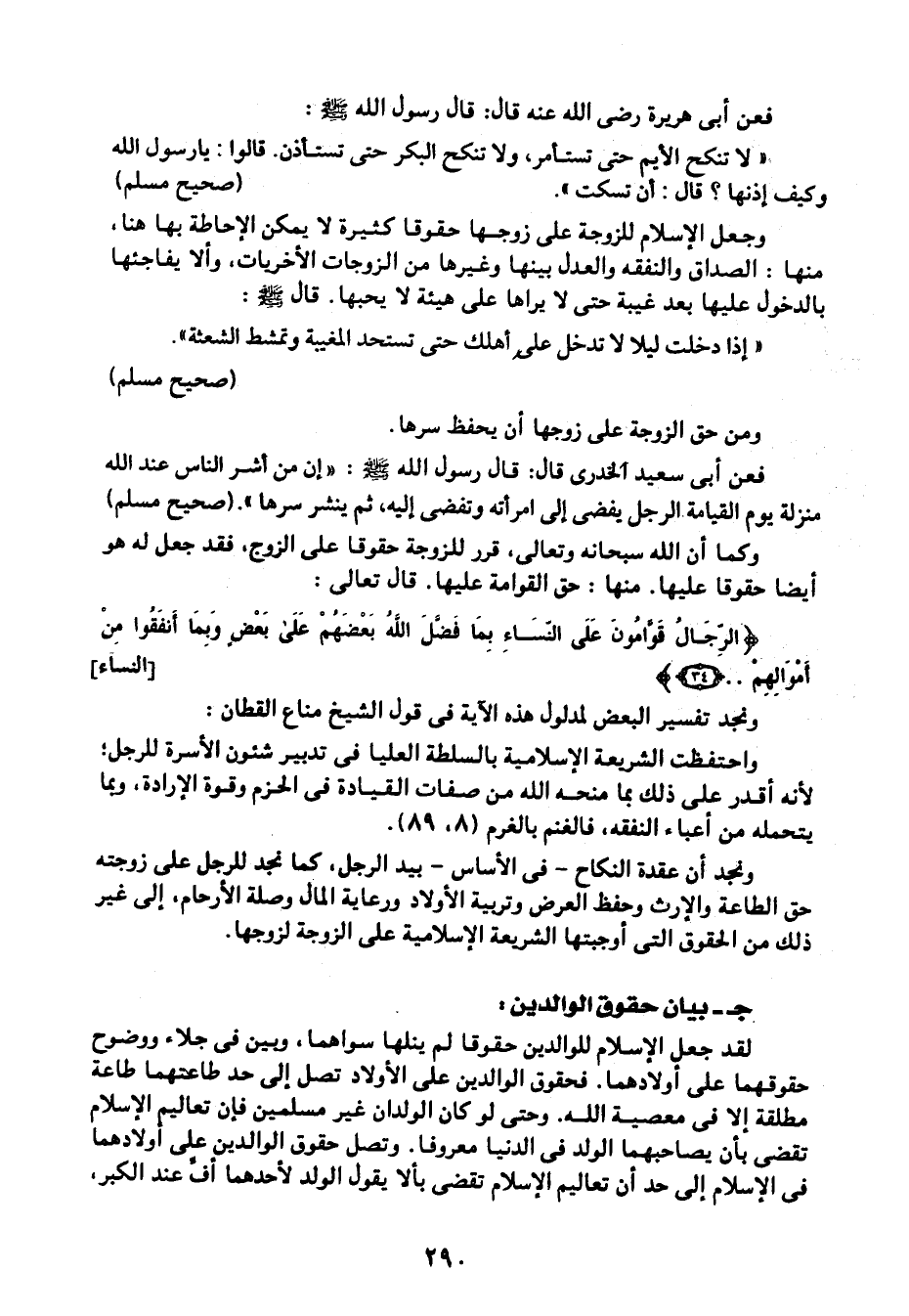 واحتفظت الشريعة الإسلامية بالسلطة العليا في تدبير شئون الأسرة للرجل؛ لأنه أقدر على ذلك بما منحه الله من صفات القيادة في الحزم وقوة الإرادة، وبما يتحمله من أعباء النفقة، فالغنم بالغرم "8، 89".