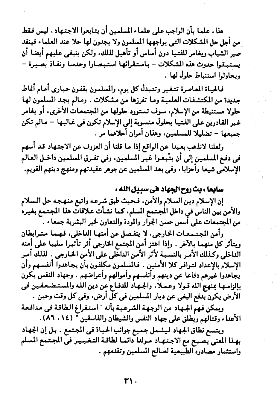 ويتسع نطاق الجهاد ليشمل جميع جوانب الحياة في المجتمع. بل إن الجهاد بهذا المعنى يصبح مع الاجتهاد مولدًا دائمًا لطاقة التغيير في المجتمع المسلم واستثمار مصادره الطبيعية لصالح المسلمين وتقدمهم.