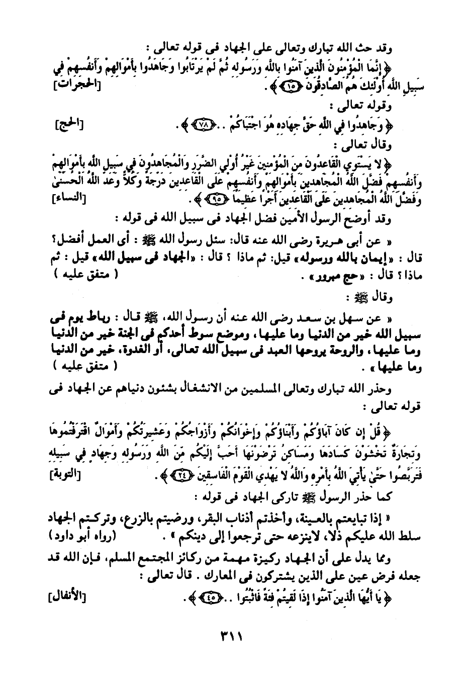 وقد حث الله تبارك وتعالى على الجهاد في قوله تعالى: {إِنَّمَا الْمُؤْمِنُونَ الَّذِينَ آمَنُوا بِاللَّهِ وَرَسُولِهِ ثُمَّ لَمْ يَرْتَابُوا وَجَاهَدُوا بِأَمْوَالِهِمْ وَأَنْفُسِهِمْ فِي سَبِيلِ اللَّهِ أُولَئِكَ هُمُ الصَّادِقُونَ} [الحجرات: 15] .