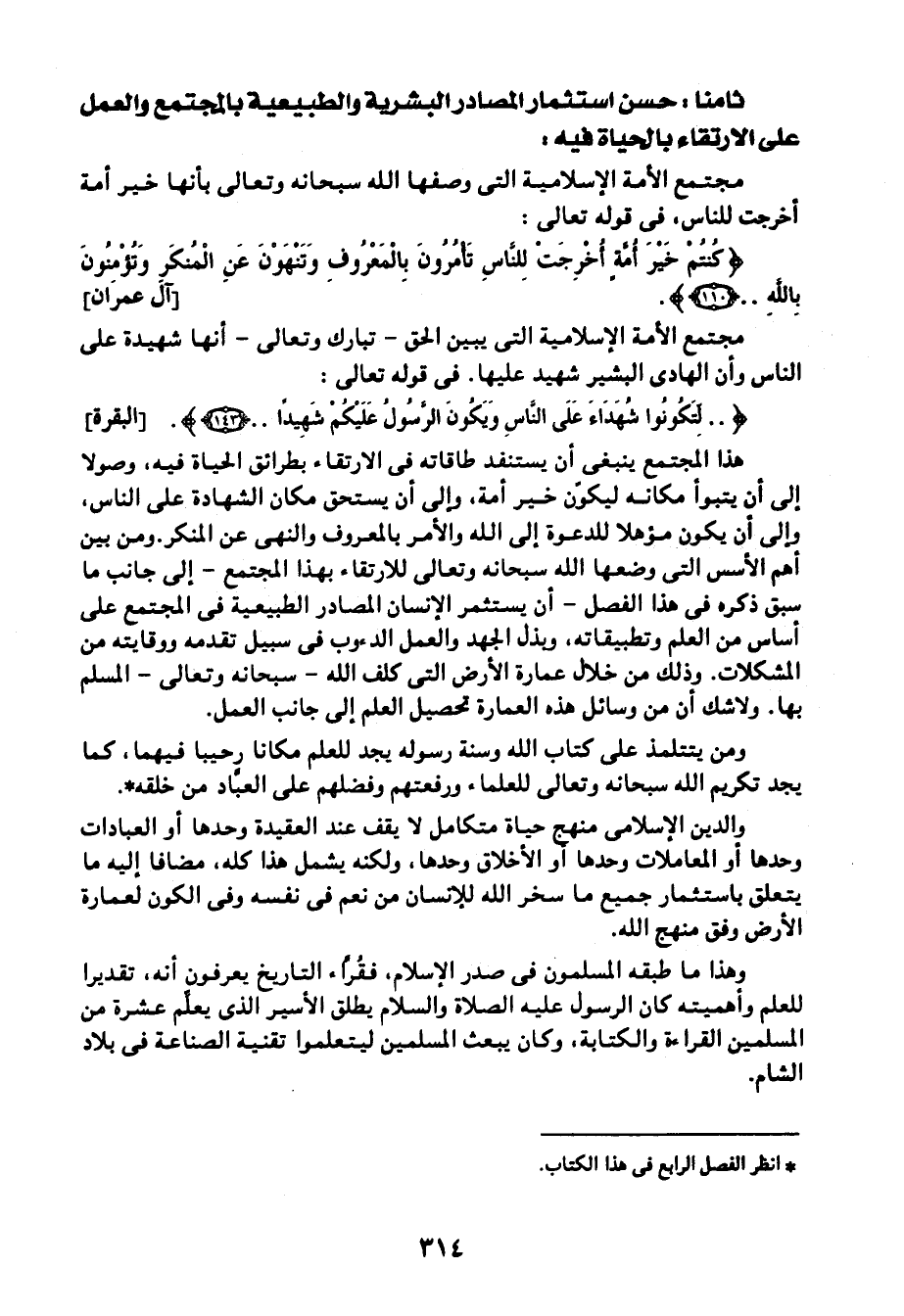 هذا المجتمع ينبغي أن يستنفد طاقاته في الارتقاء بطرائق الحياة فيه، وصولًا إلى أن يتبوأ مكانه ليكون خير أمة، وإلى أن يستحق مكان الشهادة على الناس، وإلى أن يكون مؤهلاء للدعوة إلى الله والأمر بالمعروف والنهي عن المنكر. ومن بين أهم الأسس التي وضعها الله سبحانه وتعالى للارتقاء بهذا المجتمع -إلى جانب ما سبق ذكره في هذا الفصل- أن يستثمر الإنسان المصادر الطبيعية في المجتمع على أساس من العلم وتطبيقاته، وبذل الجهد والعمل الدءوب في سبيل تقدمه ووقايته من المشكلات. وذلك من خلال عمارة الأرض التي كلف الله -سبحانه وتعالى- المسلم بها. ولا شك أن وسائل هذه العمارة تحصيل العلم إلى جانب العمل.