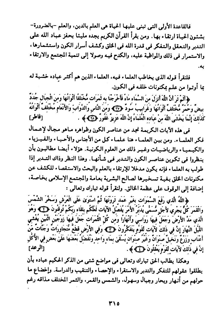 في هذ الآيات الكريمة نجد من عناصر الكون وظواهره ما هو مجال لإعمال فكر العلماء. ومن بين العلماء هنا علماء كل من الأجناس والأحياء والفيزياء والكيمياء والرياضيات وغير ذلك من العلوم الكونية. هؤلاء أيضًا مطالبون بأن ينظروا في تكوين عناصر الكون والتدبر في شأنها، وهذا النظر وذاك التدبر إذا طولب به العلماء فإنه يكون مدخلًا للارتقاء بالعلم والبحث والاسقتصاء؛ للكشف عن مكنونات الخلق بغية تسخيرها لصالح البشرية بعامة والمجتمع الإسلامي بخاصة، إضافة إلى الوقوف على عظمة الخالق. ولنقرأ قوله تبارك وتعالى: {اللَّهُ الَّذِي رَفَعَ السَّمَاوَاتِ بِغَيْرِ عَمَدٍ تَرَوْنَهَا ثُمَّ اسْتَوَى عَلَى الْعَرْشِ وَسَخَّرَ الشَّمْسَ وَالْقَمَرَ كُلٌّ يَجْرِي لِأَجَلٍ مُسَمّىً يُدَبِّرُ الْأَمْرَ يُفَصِّلُ الْآياتِ لَعَلَّكُمْ بِلِقَاءِ رَبِّكُمْ تُوقِنُونَ، وَهُوَ الَّذِي مَدَّ الْأَرْضَ وَجَعَلَ فِيهَا رَوَاسِيَ وَأَنْهَارًا وَمِنْ كُلِّ الثَّمَرَاتِ جَعَلَ فِيهَا زَوْجَيْنِ اثْنَيْنِ يُغْشِي اللَّيْلَ النَّهَارَ إِنَّ فِي ذَلِكَ لَآياتٍ لِقَوْمٍ يَتَفَكَّرُونَ، وَفِي الْأَرْضِ قِطَعٌ مُتَجَاوِرَاتٌ وَجَنَّاتٌ مِنْ أَعْنَابٍ وَزَرْعٌ وَنَخِيلٌ صِنْوَانٌ وَغَيْرُ صِنْوَانٍ يُسْقَى بِمَاءٍ وَاحِدٍ وَنُفَضِّلُ بَعْضَهَا عَلَى بَعْضٍ فِي الْأُكُلِ إِنَّ فِي ذَلِكَ لَآياتٍ لِقَوْمٍ يَعْقِلُونَ} [الرعد: 2-4] .