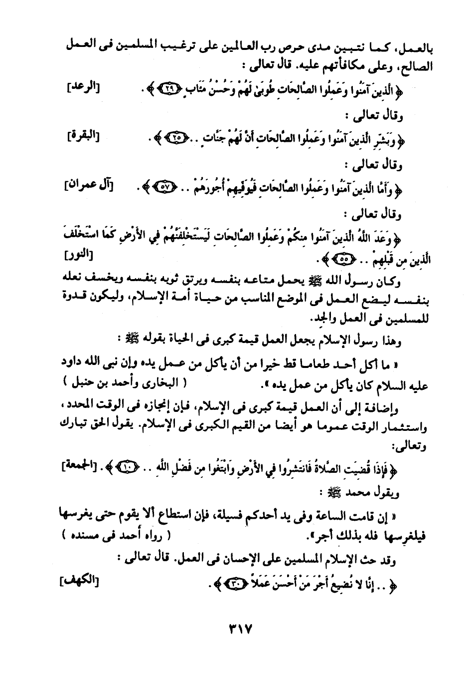 وهذا رسول الإسلام يجعل العمل قيمة كبرى في الحياة بقوله -صلى الله عليه وسلم: "ما أكل أحد طعامًا قط خيرًا من أن يأكل من عمل يده, وإن نبي الله داود عليه السلام كان يأكل من عمل يده". "البخاري وأحمد بن حنبل".
