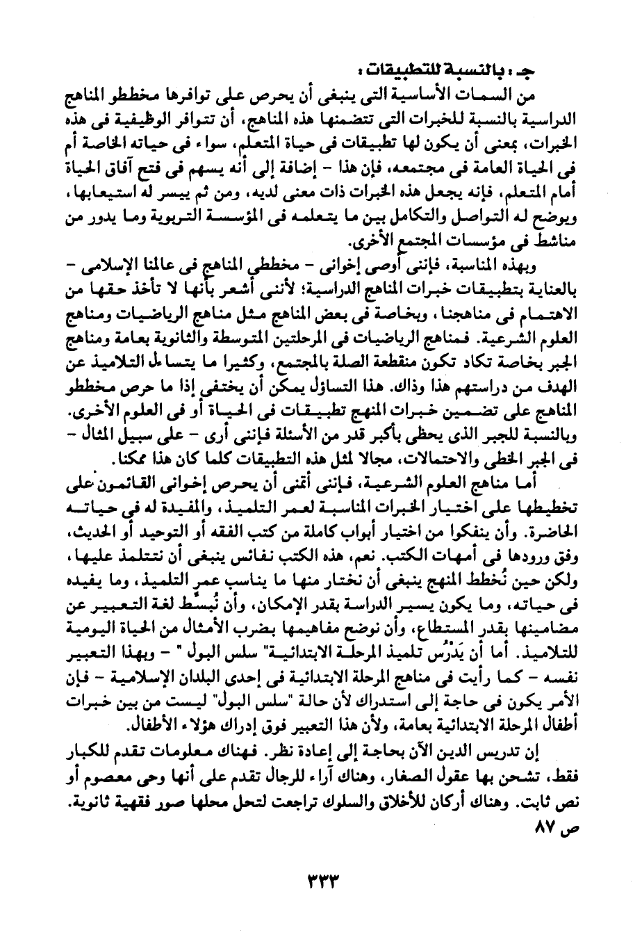 أما مناهج العلوم الشرعية، فإنني أتمنى أن يحصر إخواني القائمون على تخطيطها على اختيار الخبرات المناسبة لعمر التلميذ، والمفيدة له في حياته الحاضرة. وأن ينفكوا من اختيار أبواب كاملة من كتب الفقه أو التوحيد أو الحديث، وفق ورودها في أمهات الكتب. نعم هذه الكتب نفائس ينبغي أن نتتلمذ عليها، ولكن حين نخطط المنهج ينبغي أن نختار منها يناسب عمر التلميذ, وما يفيده في حياته، وما يكون يسير الدراسة بقدر الإمكان، وأن نبسط لغة التعبير عن مضامينها بقدر المستطاع، وأن نوضح مفاهيمها بضرب الأمثال من الحياة اليومية للتلاميذ. إما أن يدرس تلميذ المرحلة الابتدائية "سلسل البول" -وبهذا التعبير نفسه- كما رأيت في مناهج المرحلة الابتدائية في إحدى البلدان الإسلامية, فإن الأمر يكون في حاجة إلى استدراك؛ لأن حالة "سلس البول" ليست من بين خبرات أطفال المرحلة الابتدائية بعامة؛ ولأن هذا التعبير فوق إدراك هؤلاء الأطفال.