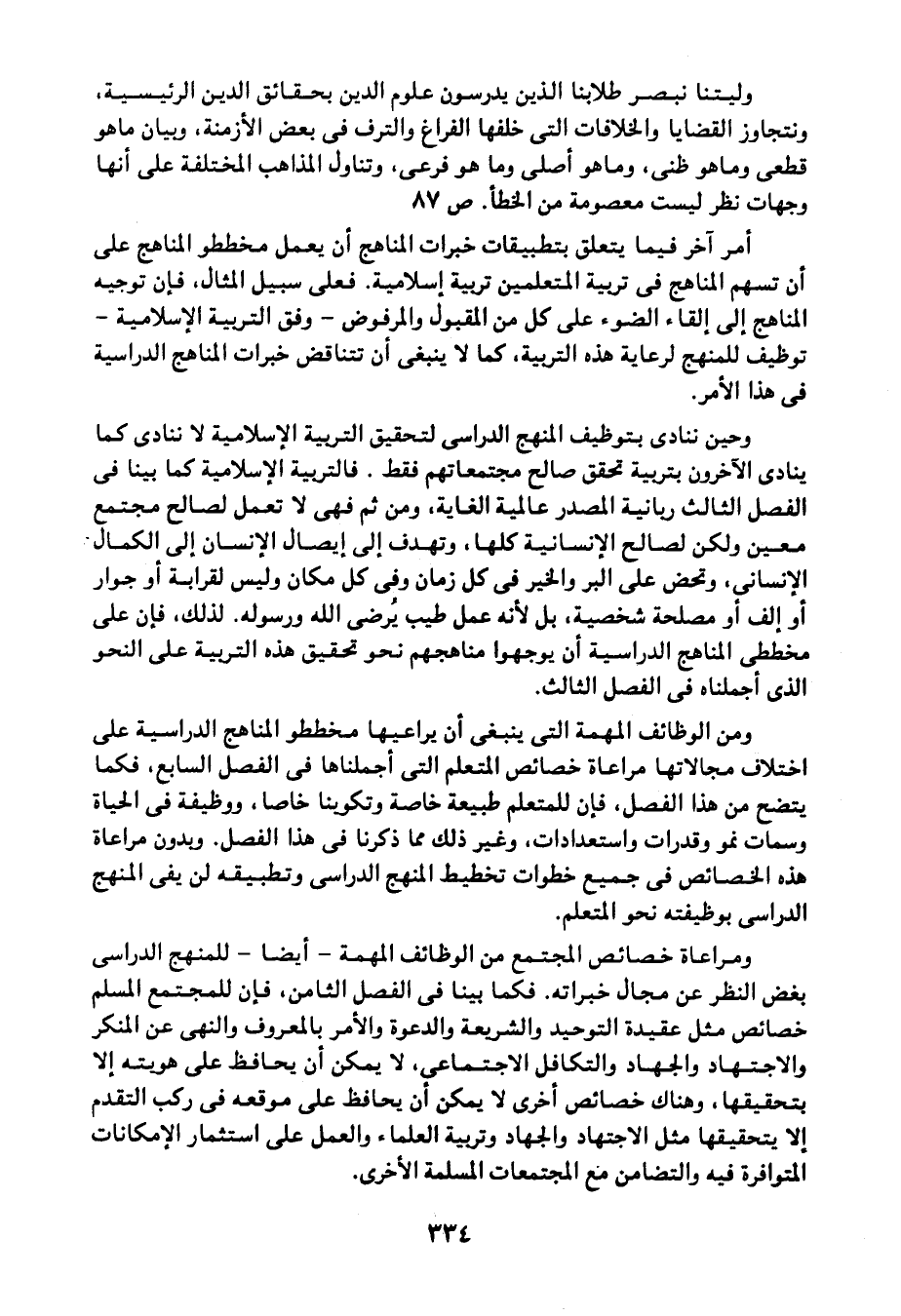 وحين ننادي بتوظيف المنهج الدراسي لتحقيق التربية الإسلامية لا ننادي كما ينادي الآخرون بتربية تحقق صالح مجتمعاتهم فقط. فالتربية الإسلامية كما بينا في الفصل الثالث ربانية المصدر عالمية الغاية، ومن ثم فهي لا تعمل لصالح مجتمع معين ولكن لصالح الإنسانية كلها، وتهدف إلى إيصال الإنسان إلى الكمال الإنساني، وتحض على البر والخير في كل زمان وفي كل مكان, وليس لقرابة أو جوار أو إلف أو مصلحة شخصية؛ بل لأنه عمل طيب يرضي الله ورسوله. لذلك فإن على مخططي المناهج الدراسية أن يوجهوا مناهجهم نحو تحقيق هذه التربية على النحو الذي أجملناه في الفصل الثالث.