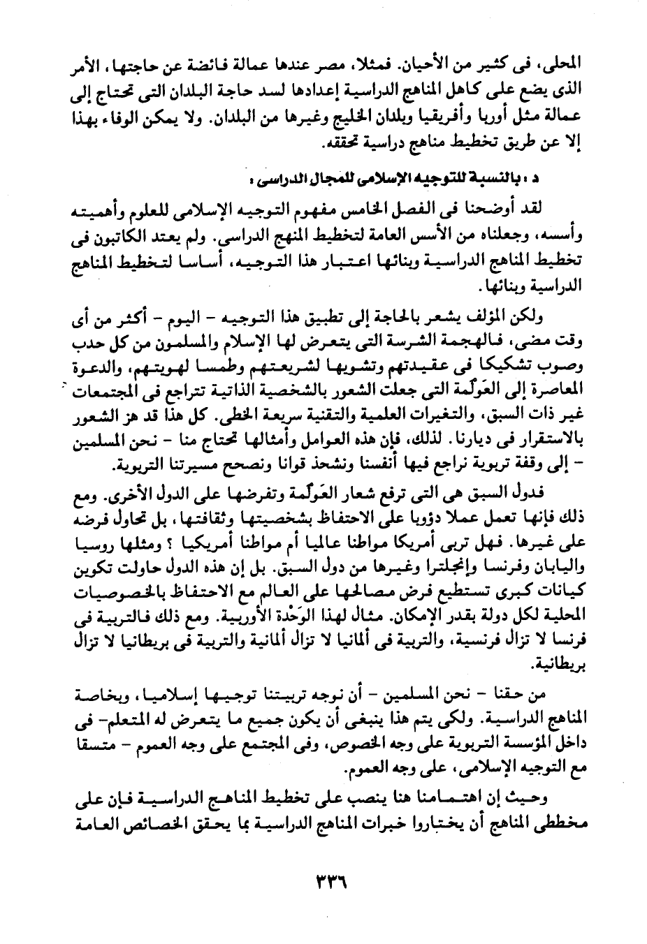 من حقنا -نحن المسلمين- أن نوجه تربيتنا توجيهًا إسلاميا، وبخاصة المناهج الدراسية. ولكي يتم هذا ينبغي أن يكون جميع ما يتعرض له المتعلم -في داخل المؤسسة التربوية على وجه الخصوص، وفي المجتمع على وجه العموم- متسقًا مع التوجيه الإسلامي، على وجه العموم.