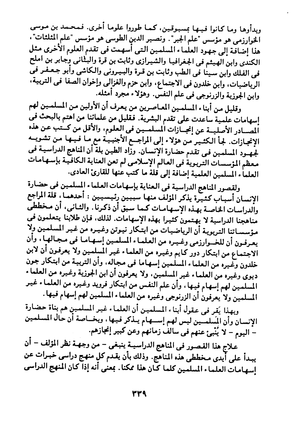 وبدءوها وما كانوا فيها بمسبوقين، كما طوروا علومًا أخرى. فمحمد بن موسى الخوارزمي هو مؤسس "علم الجبر". ونصير الدين الطوسي هو مؤسس "علم المثلثات"، هذا إضافة إلى جهود العلماء المسلمين التي أسهمت في تقدم العلوم الأخرى مثل: الكندي وابن الهيثم في الجغرافيا والشيرازي وثابت بن قرة والبناني وجابر بن أملح في الفلك وابن سينا في الطب وثابت بن قرة والبيروني والكاشي وأبو جعفر في الرياضيات وابن خلدون في الاجتماع، وابن حزم والغزالي وإخوان الصفا في التربية وابن الجوزية والزرنوجي في علم النفس. وهؤلاء مجرد أمثلة.