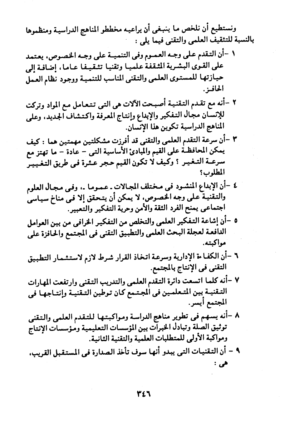 ونستطيع أن نلخص ما ينبغي أن يراعيه مخططو المناهج الدراسية ومنظموها بالنسبة للتثقيف العلمي والتقني فيما يلي: