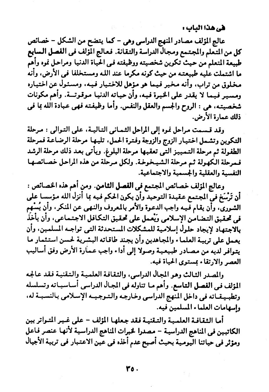 عالج المؤلف مصادر المنهج الدراسي وهي -كما يتضح من الشكل- خصائص كل من المتعلم والمجتمع ومجال الدراسة والتقانة. فعالج المؤلف في الفصل السابع طبيعة المتعلم من حيث تكوين شخصيته ووظيفته في الحياة الدنيا ومراحل نموه وأهم ما اشتملت عليه طبيعته من حيث كونه مكرمًا عند الله ومستخلفًا في الأرض، وأنه مخلوق من تراب، وأنه مخير فيما هو مؤهل للاختيار فيه، ومسئول عن اختياره ومسير فيما لا يقدر على الخيرة فيه، وأن حياته الدنيا موقوتة، وأهم مكونات شخصيته، هي: الروح والجسم والعقل والنفس. وأما وظيفته فهي عبادة الله بما في ذلك عمارة الأرض.