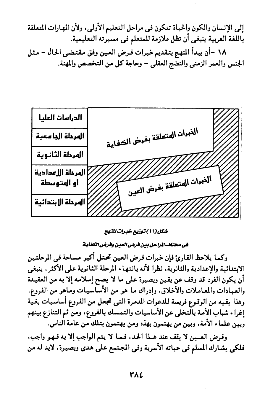 وكما يلاحظ القارئ فإن خبرات فرض العين تحتل أكبر مساحة في المرحلتين الابتدائية والإعدادية والثانوية؛ نظرًا لأنه بانتهاء المرحلة الثانوية على الأكثر، ينبغي أن يكون الفرد قد وقف عن يقين وبصيرة على ما لا يصح إسلامه إلا به من العقيدة والعبادات والمعاملات والأخلاق، وإدراك ما هو من الأساسيات وما هو من الفروع.