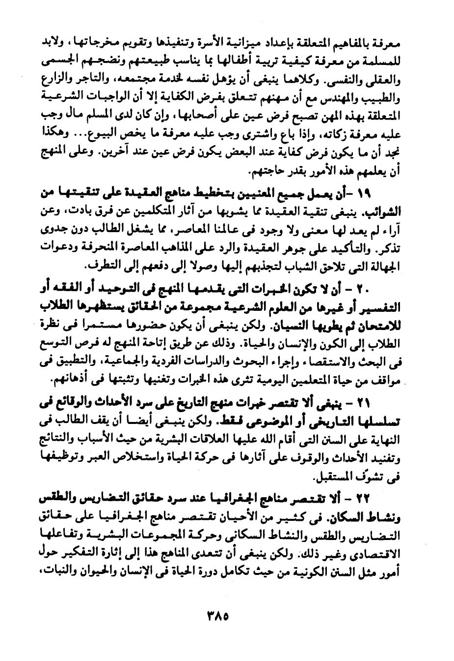 19- أن يعمل جميع المعنيين بتخطيط مناهج العقيدة على تنقيتها من الشوائب. ينبغي تنقية العقيدة مما يشوبها من آثار المتكلمين عن فرق بادت، وعن آراء لم يعد لها معنى ولا وجود في عالمنا المعاصر، مما يشغل الطالب دون جدوى تذكر. والتأكيد على جوهر العقيدة والرد على المذاهب المعاصرة المنحرفة ودعوات الجهالة التي تلاحق الشباب لتجذبهم إليها وصولًا إلى دفعهم إلى التطرف.