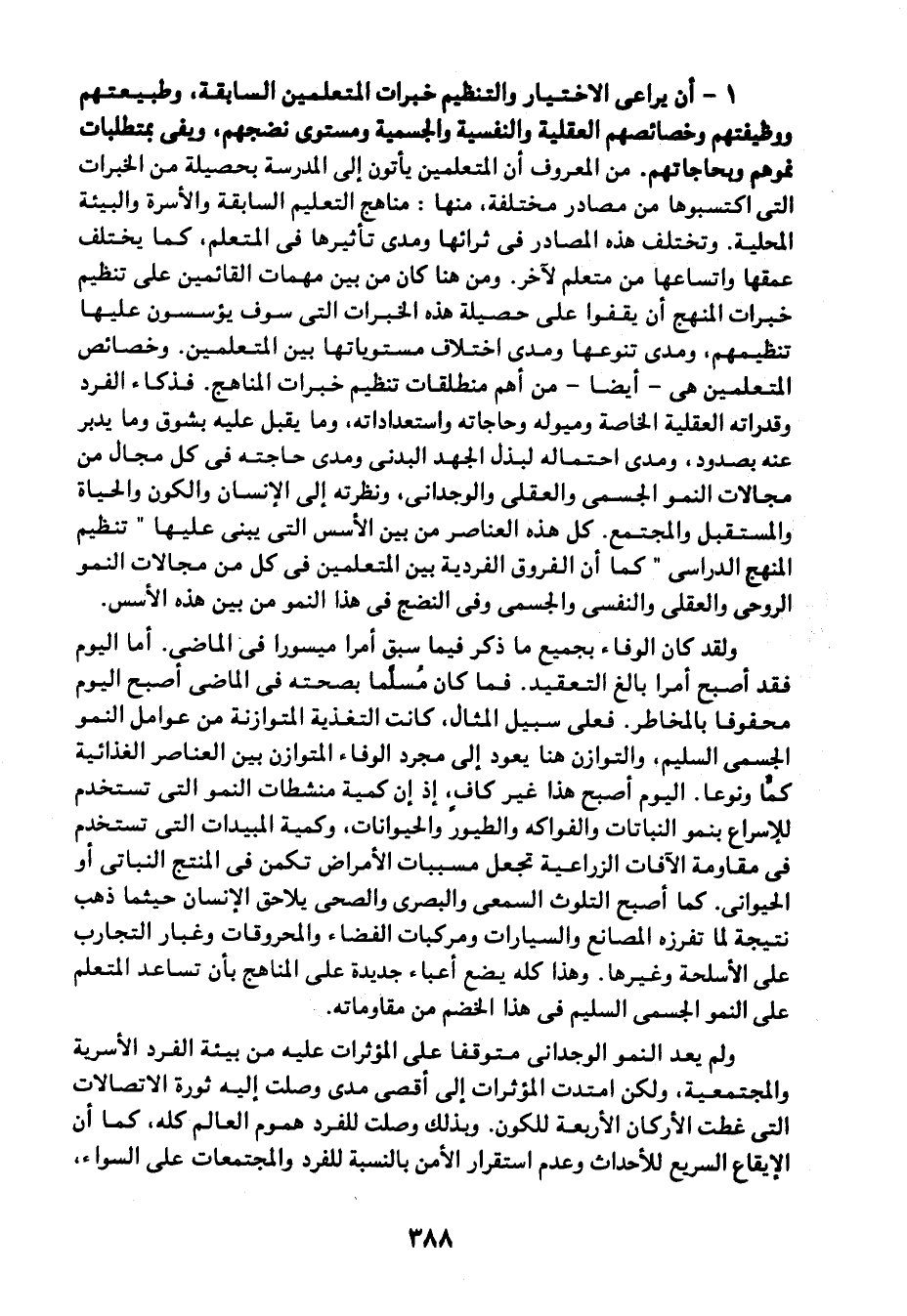 1- أن يراعي الاختيار والتنظيم خبرات المتعلمين السابقة، وطبيعتهم ووظيفتهم وخصائصهم العقلية والنفسية والجسمية ومستوى نضجهم، ويفي بمتطلبات نموهم وبحاجاتهم. من المعروف أن المتعلمين يأتون إلى المدرسة بحصيلة من الخبرات التي اكتسبوها من مصادر مختلفة، منها: مناهج التعليم السابقة والأسرة والبيئة المحلية. وتختلف هذه المصادر في ثرائها ومدى تأثيرها في المتعلم، كما يختلف عمقها واتساعها من المتعلم لآخر. ومن هنا كان من بين مهمات القائمين على تنظيم خبرات المنهج أن يقفوا على حصيلة هذه الخبرات التي سوف يؤسسون عليها تنظيمهم. ومدى تنوعها ومدى اختلاف مستوياتها بين المتعلمين. وخصائص المتعلمين هي -أيضًا- من أهم منطلقات تنظيم خبرات المناهج. فذكاء الفرد وقدراته العقلية الخاصة وميوله وحاجاته واستعدادته، وما يقبل عليه بشوق وما يدبر عنه بصدود، ومدى احتماله لبذل الجهد البدني, ومدى حاجته في كل مجال من مجالات النمو الجسمي والعقلي والوجداني، ونظرته إلى الإنسان والكون والحياة والمستقبل والمجتمع. كل هذه العناصر من بين الأسس التي يبنى عليها "تنظيم المنهج الدراسي" كما أن الفروق الفردية بين المتعلمين في كل من مجالات النمو الروحي والعقلي والنفسي والجسمي وفي النضج في هذا النمو من بين هذه الأسس.