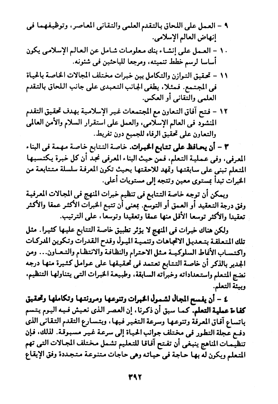 11- تحقيق التوازن والتكامل بين خبرات مختلف المجالات الخاصة بالحياة في المجتمع, فمثلًا يطغى الجانب التعبدي على جانب اللحاق بالتقدم العلمي والتقاني أو العكس.