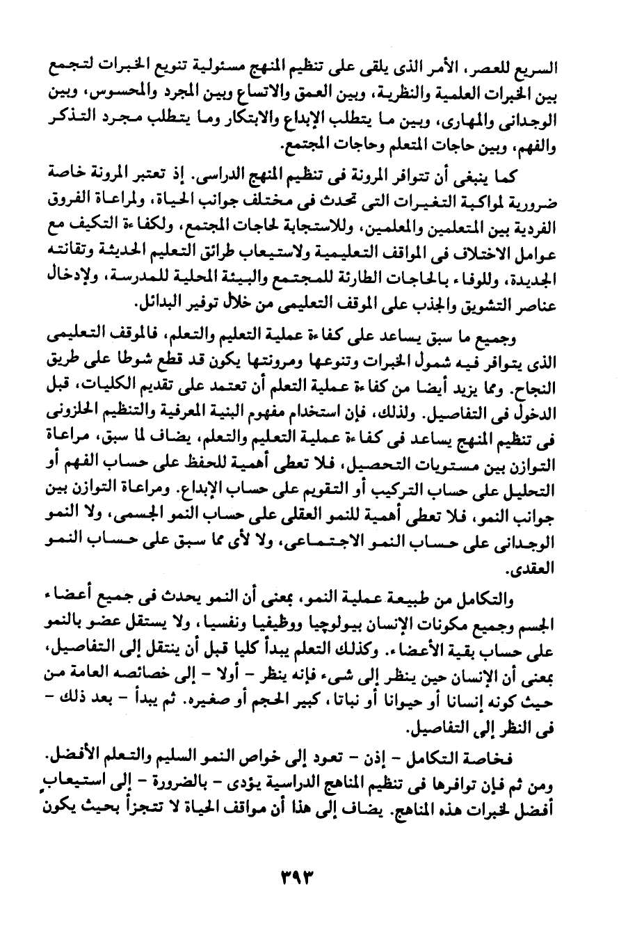 فخاصة التكامل -إذن- تعود إلى خواص النمو السليم والتعلم الأفضل. ومن ثم فإن توافرها في تنظيم المناهج الدراسية يؤدي -بالضرورة- إلى استيعاب أفضل لخبرات هذه المناهج. يضاف إلى هذا أن مواقف الحياة لا تتجزأ بحيث يكون