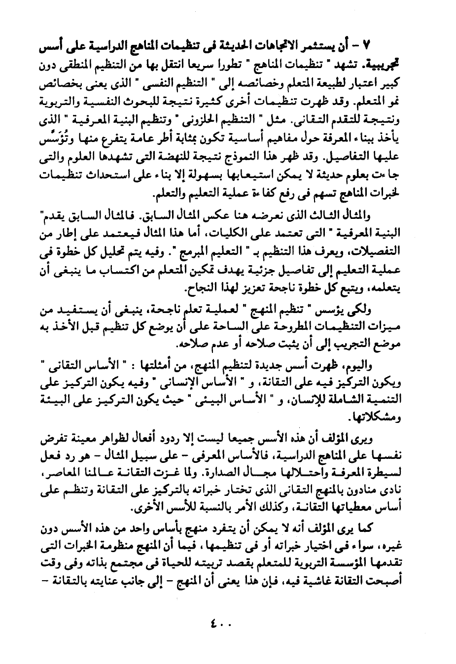 7- أن يستثمر الاتجاهات الحديثة في تنظيمات المناهج الدراسية على أسس تجريبية، تشهد "تنظيمات المناهج" تطورًا سريعًا انتقل بها من التنظيم المنطقي دون كبير اعتبار لطبيعة المتعلم وخصائصه إلى "التنظيم النفسي" الذي يعنى بخصائص نمو المتعلم. وقد ظهرت تنظيمات أخرى كثيرة نتيجة للبحوث النفسية والتربوية ونتيجة للتقدم التقاني. مثل "التنظيم الحلزوني", "وتنظيم البنية المعرفية" الذي يأخذ ببناء المعرفة حول مفاهيم أساسية تكون بمثابة أطر عامة يتفرع منها, وتؤسس عليها التفاصيل، وقد ظهر هذا النموذج نتيجة للنهضة التي تشهدها العلوم, والتي جاءت بعلوم حديثة لا يمكن استيعابها بسهولة إلا بناء على استحداث تنظيمات لخبرات المناهج تسهم في رفع كفاءة عملية التعليم والتعلم.