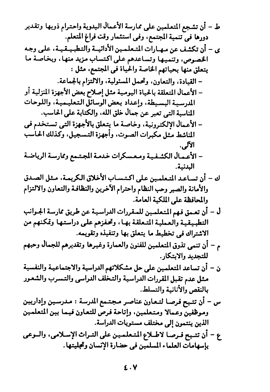 ط- أن تشجع المتعلمين على ممارسة الأعمال اليدوية واحترام ذويها وتقدير دورها في تنمية المجتمع، وفي استثمار وقت فراغ المتعلم.