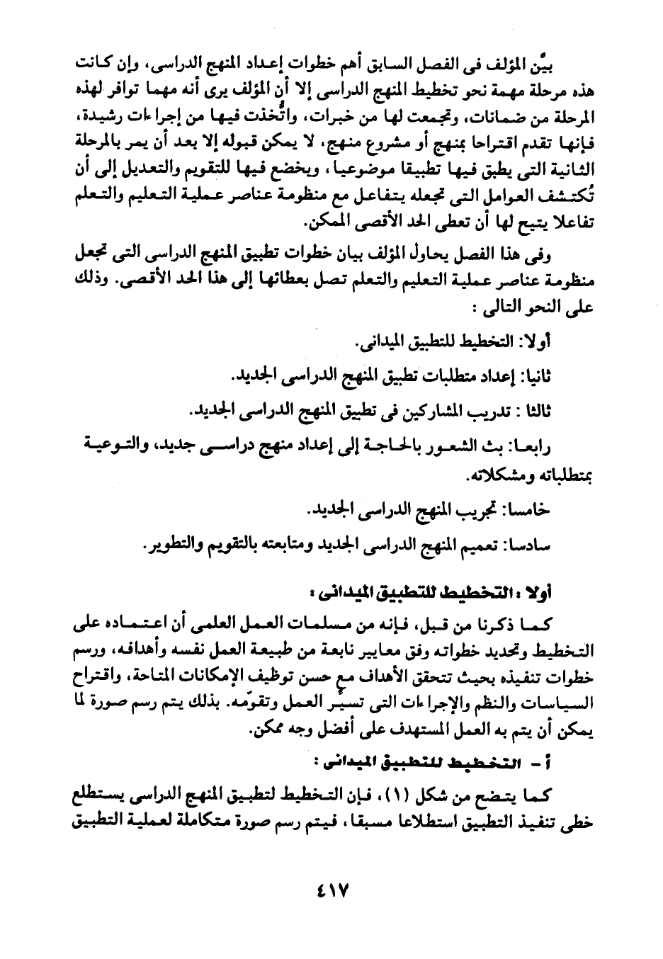 بين المؤلف في الفصل السابق أهم خطوات إعداد المنهج الدراسي. وإن كانت هذه مرحلة مهمة نحو تخطيط المنهج الدراسي, إلا أن المؤلف يرى أنه مهما توافر لهذه المرحلة من ضمانات، وتجمعت لها من خبرات، واتخذت فيها من إجراءات رشيدة، فإنها تقدم اقتراحًا بمنهج أو مشروع منهج، لا يمكن قبوله إلا بعد أن يمر بالمرحلة الثانية التي يطبق فيها تطبيقًا موضوعيا، ويخضع فيها للتقويم والتعديل إلى أن تكتشف العوامل التي تجعله يتفاعل مع منظومة عناصر عملية التعليم والتعلم تفاعلًا يتيح لها أن تعطي الحد الأقصى.